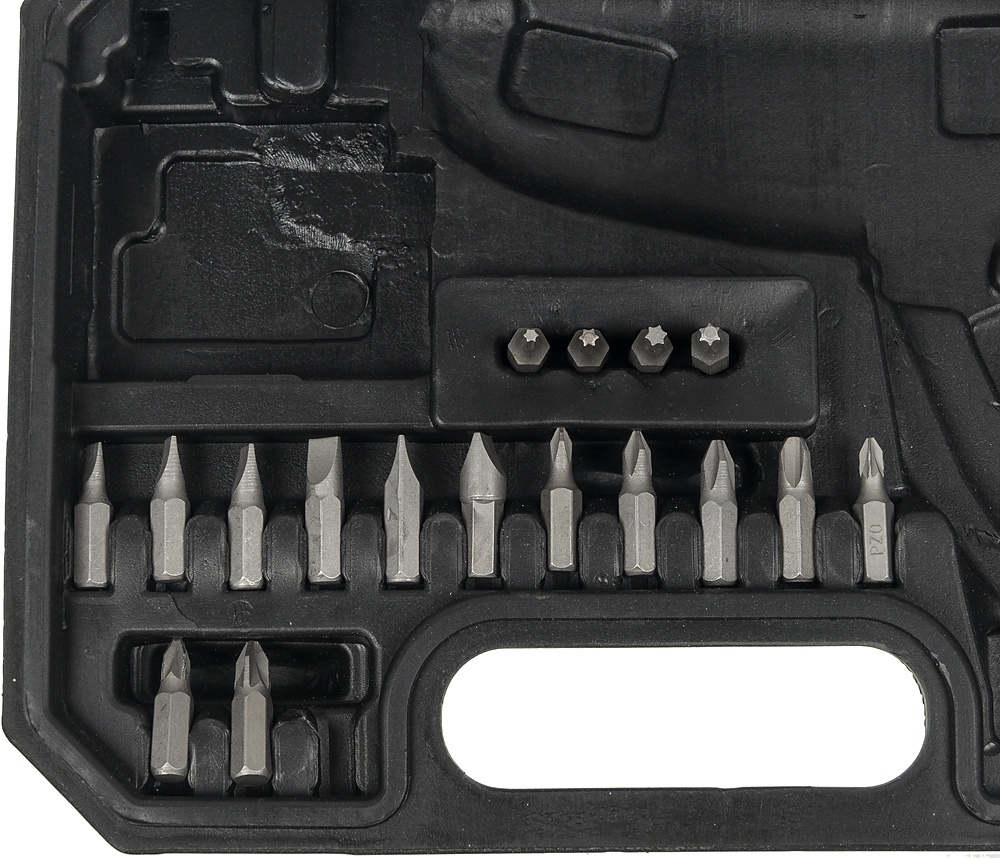 - Комплект поставкиОтвертка электрическая, зарядное устройство, набор бит, кейс