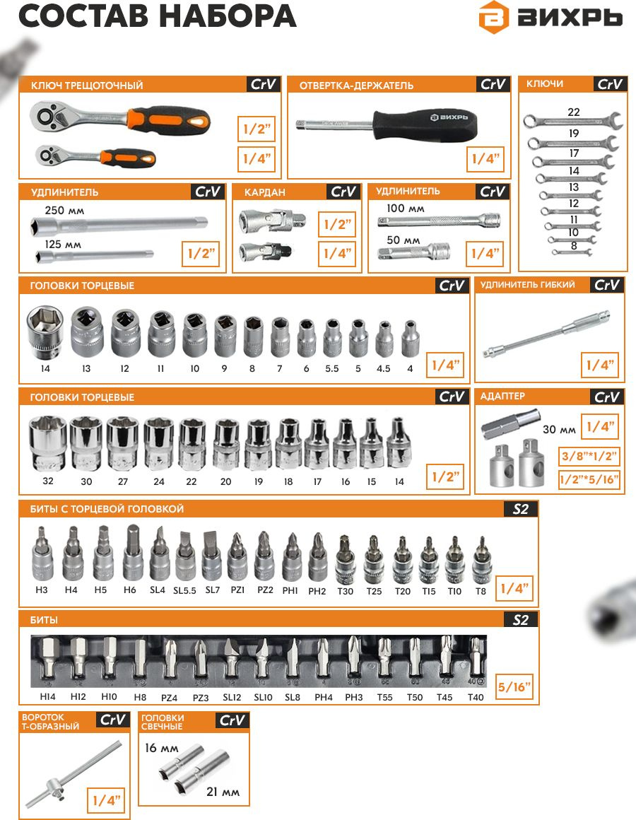 Головки: 1/2"" 14, 15, 16, 17, 18, 19, 20, 22, 24, 27, 30, 32 CrV; 1/4"" 4, 4.5, 5, 5.5, 6, 7, 8, 9, 10, 11, 12, 13, 14 CrV; свечные 16 мм и 21 мм CrV. Биты с торцевой головкой 1/4"" Н3, H4, H5, H6 S2; T8, T10, T15, T20, T25, T30; SL 4, SL 5.5, SL 7; PH1, PH2; PZ1, PZ2. - Жесткий кейсДа