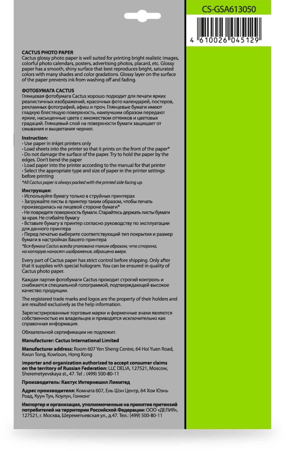 Фотобумага Cactus CS-GSA613050 A6/130г/м2/50л. глянцевое самоклей. для струйной печати