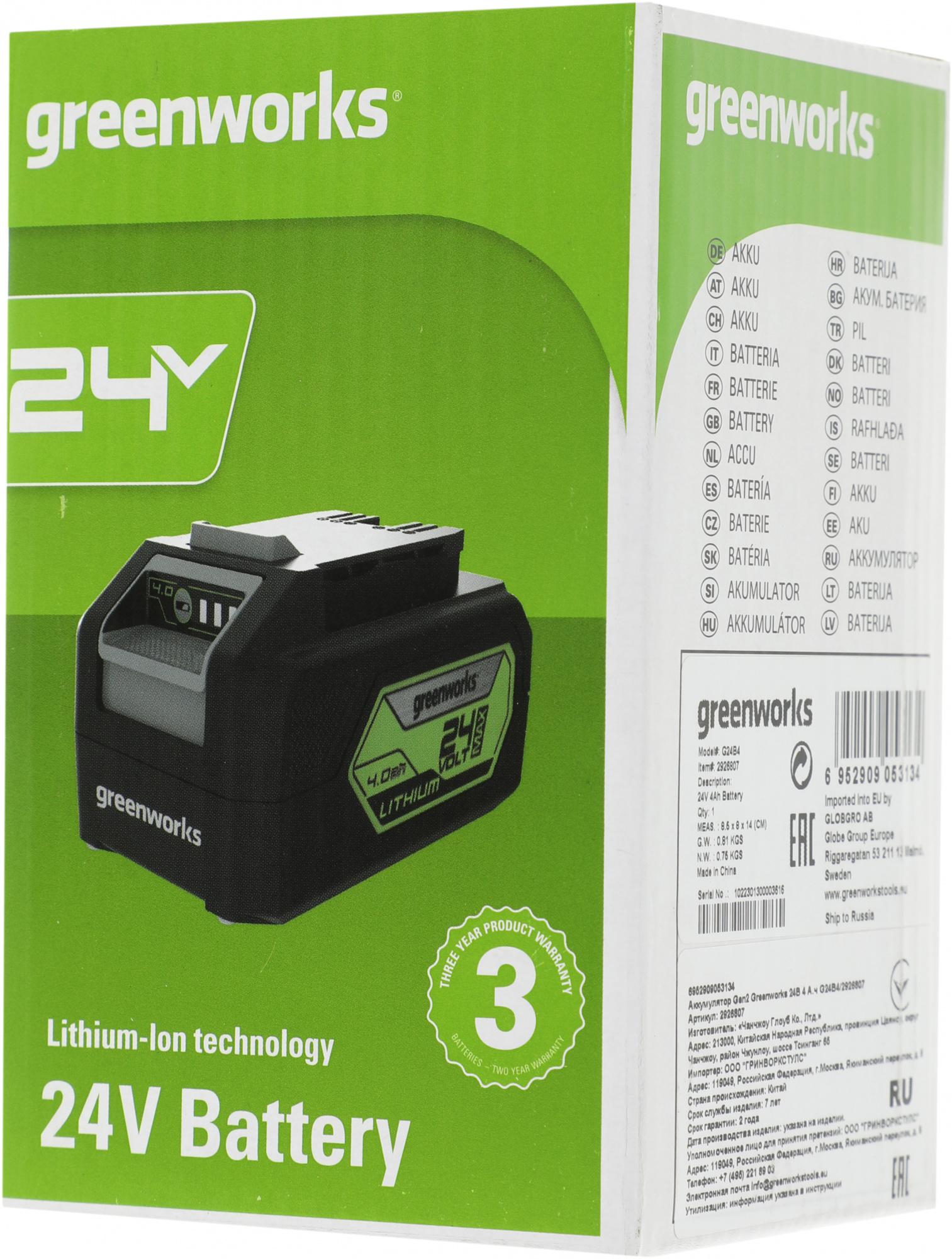 Батарея аккумуляторная Greenworks G24B4 24В 4Ач Li-Ion (2926807)