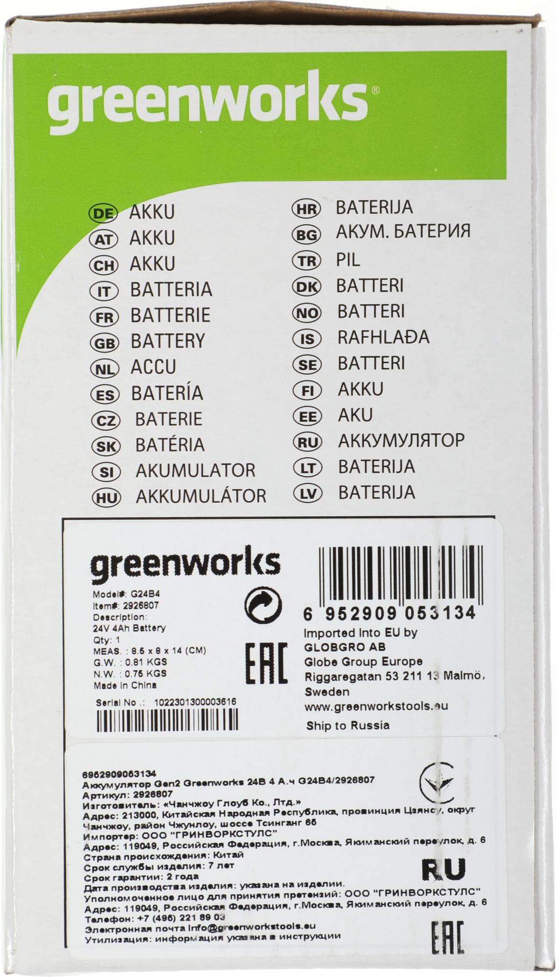 | Производитель | GREENWORKS |