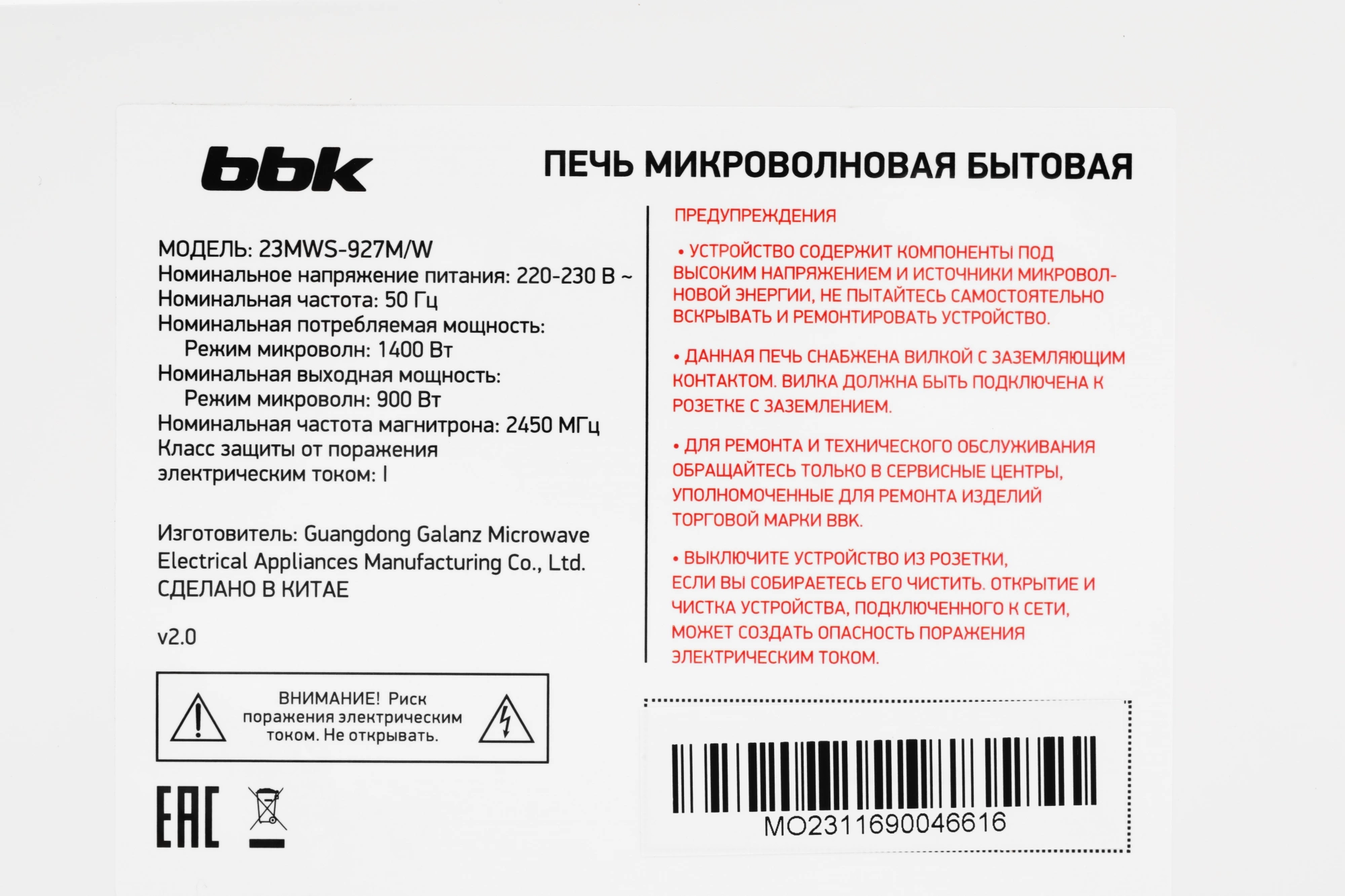 Микроволновая Печь BBK 23MWS-927M/W/RU MG 23л. 900Вт белый