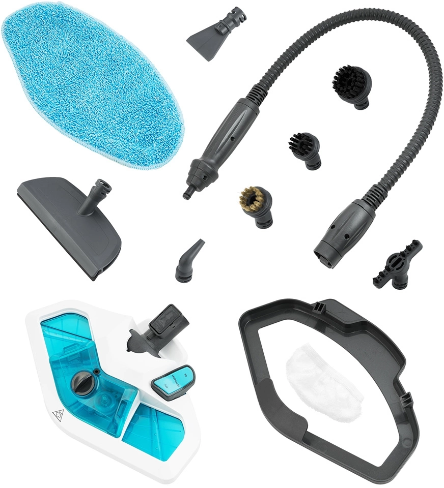 - КомплектацияРучной модуль, базовый блок, удлинительная ручка, щетка для пола, тряпка для пола, рамка для ковра, круглые нейлоновые щетки - 3 шт., угловая насадка, скребок, плоская нейлоновая щетка, насадка для отпаривания, тряпка для отпаривания, удлинительный шланг.