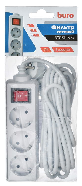 Сетевой фильтр Buro 300SL-5-G 5м (3 розетки) серый (пакет ПЭ)