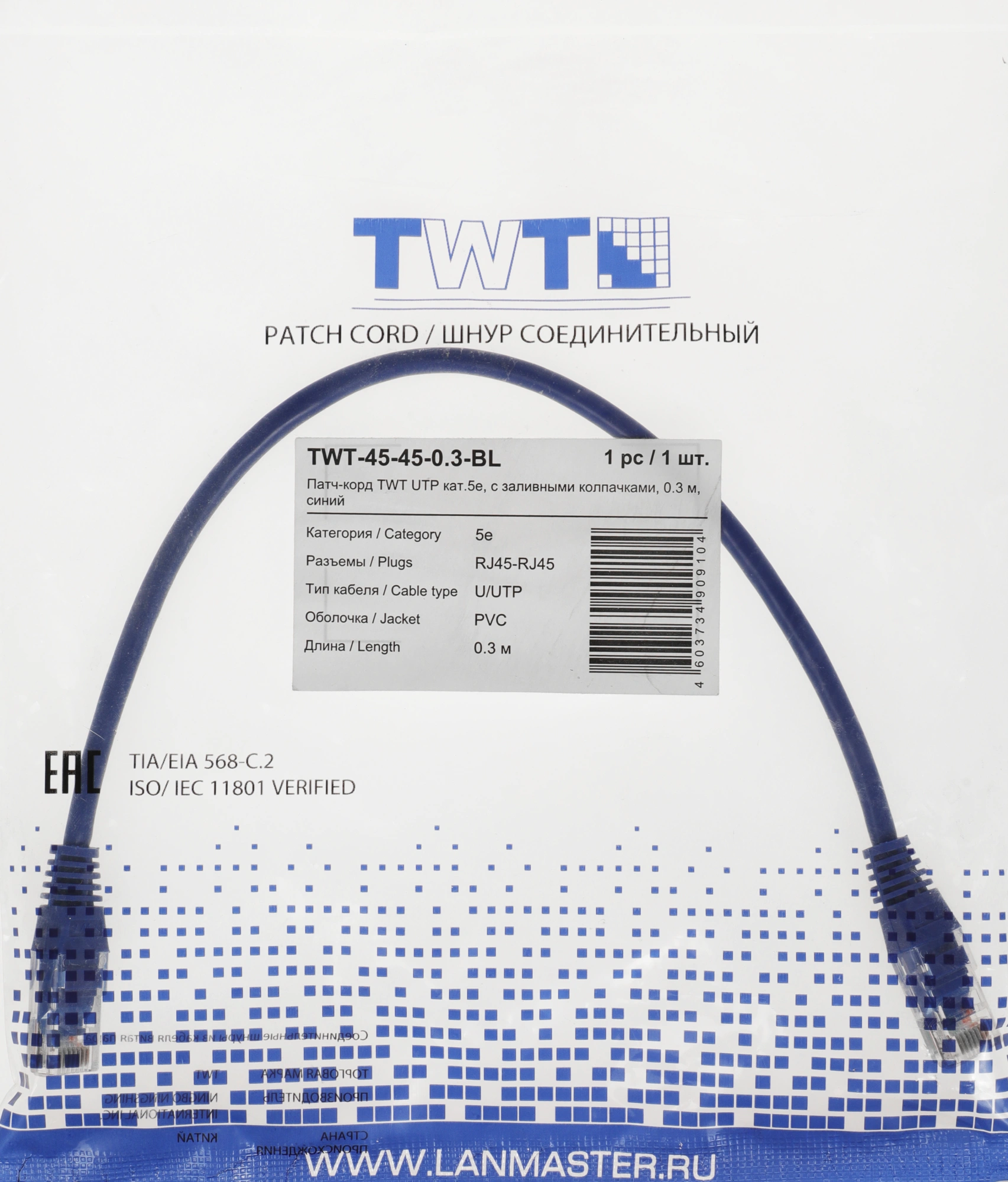 Патч-корд Lanmaster TWT-45-45-0.3-BL UTP RJ-45 вил.-вилка RJ-45 кат.5E 0.3м синий ПВХ (уп.:1шт)