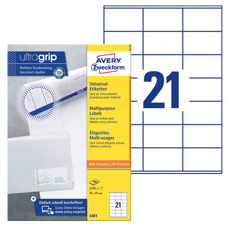 Этикетки Avery Zweckform 3481 A4 70x41мм 21шт на листе/70г/м2/100л./белый матовое самоклей. универсальная