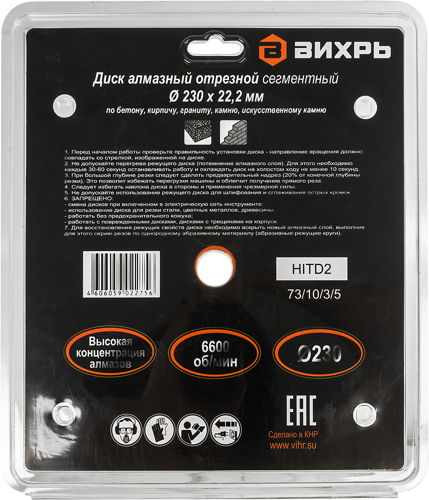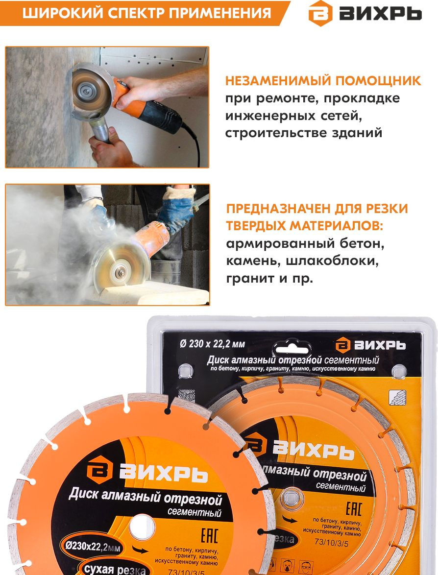 Диск отрезной по бет. Вихрь 73/10/3/5 d=230мм d(посад.)=22.2мм (угловые шлифмашины)