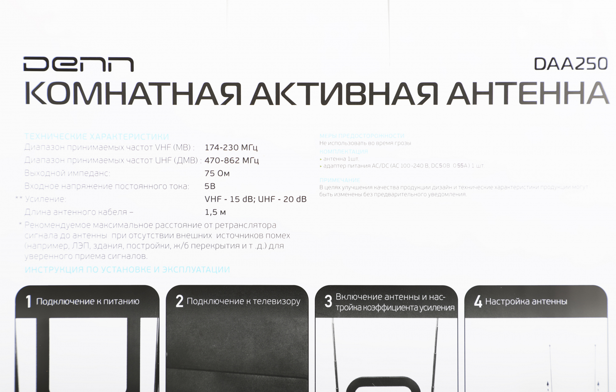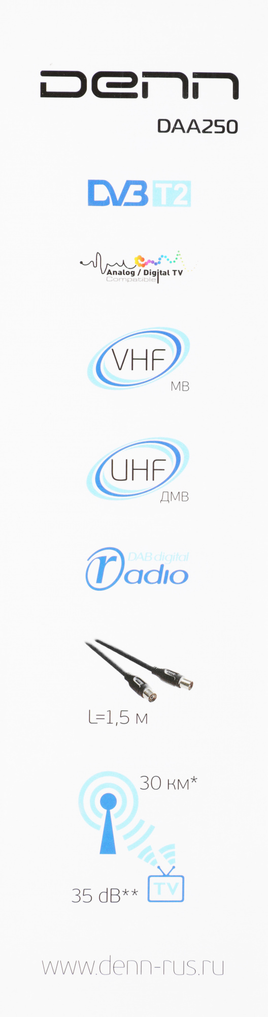Антенна телевизионная Denn DAA250 35дБ активная черный каб.:1м