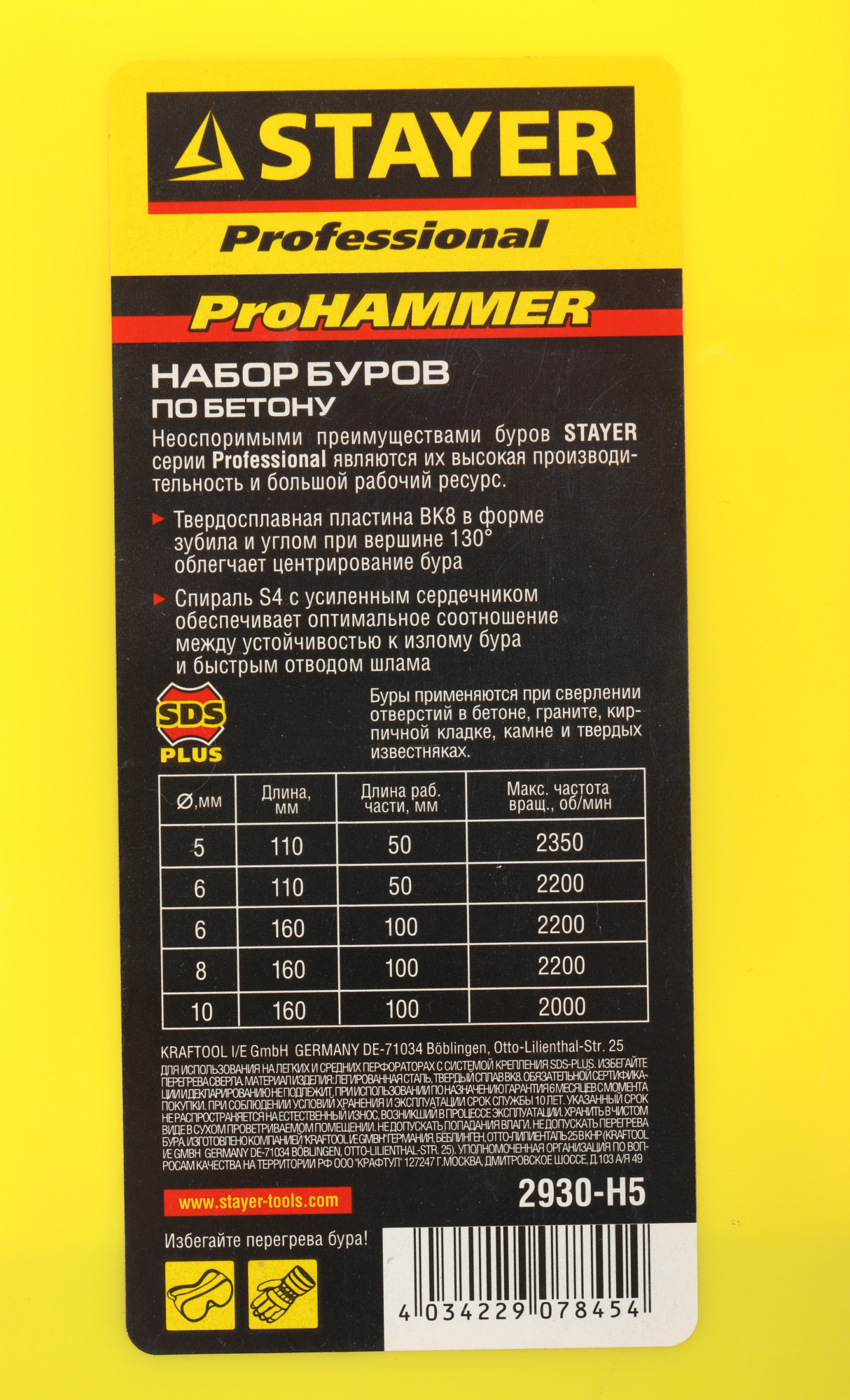 Набор буров Stayer 2930-H5 по бетону (5пред.) для дрелей/перфораторов