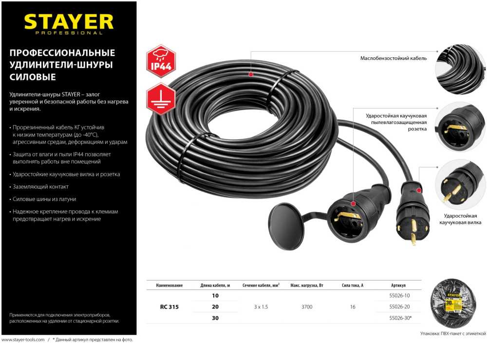 Удлинитель силовой Stayer 55026-20 3x1.5кв.мм 1розет. 20м КГ без катушки черный