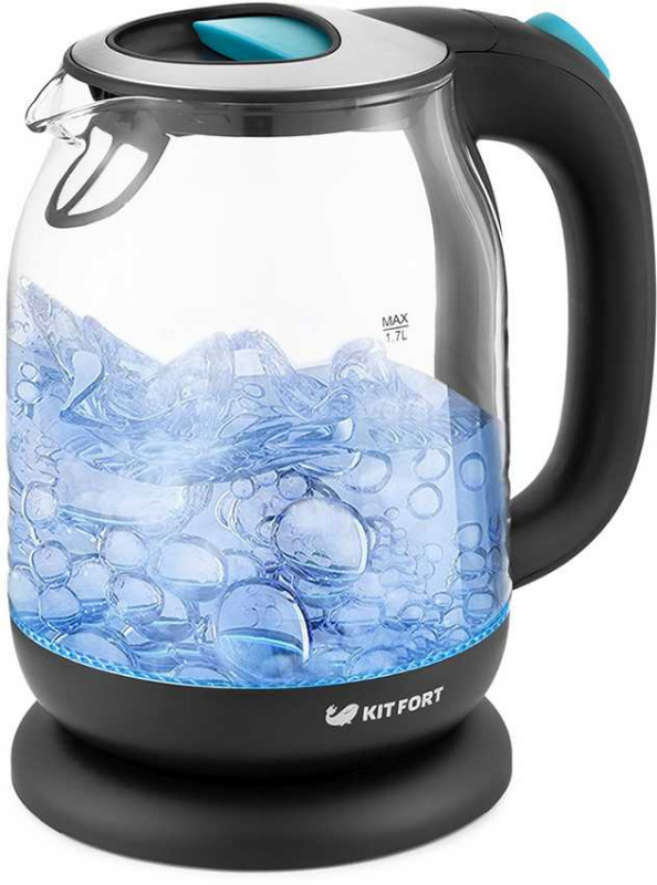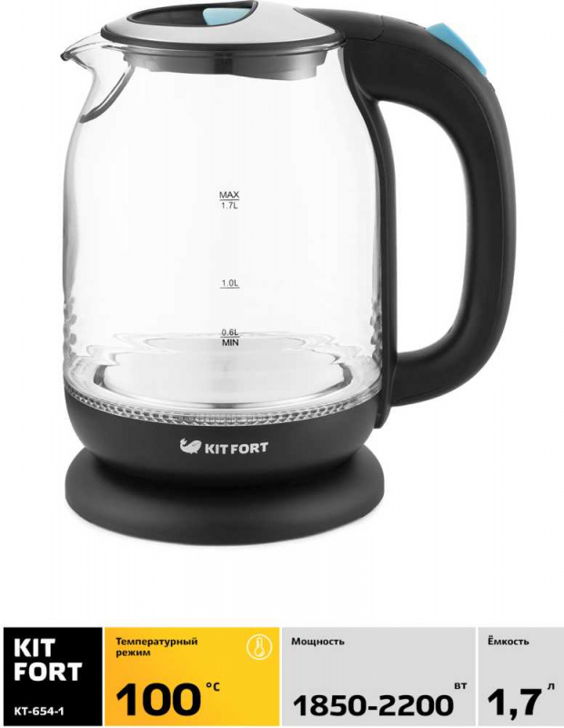 Чайник электрический Kitfort КТ-654-1 1.7л. 2200Вт черный/голубой корпус: стекло/пластик