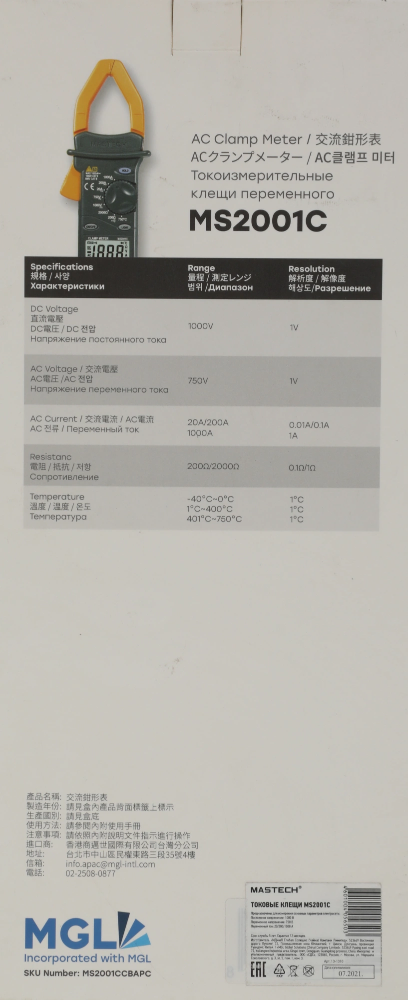 Токоизмерительные клещи MS2001 предназначены для измерения силы переменного тока, постоянного и переменного напряжения и сопротивления. С помощью данного прибора можно проверить качество соединений в электрической схеме. Последний полученный результат можно зафиксировать с помощью функции DATA HOLD.