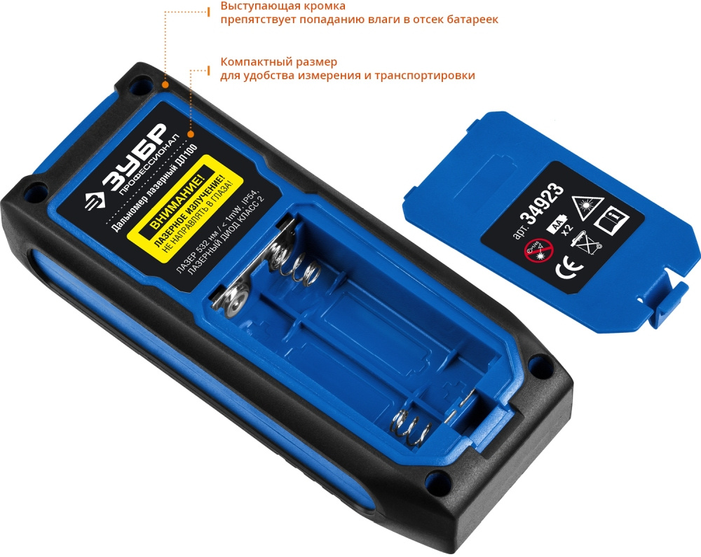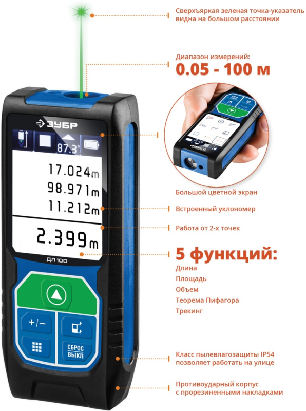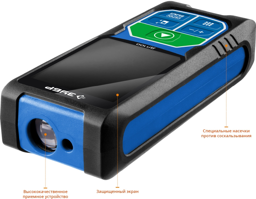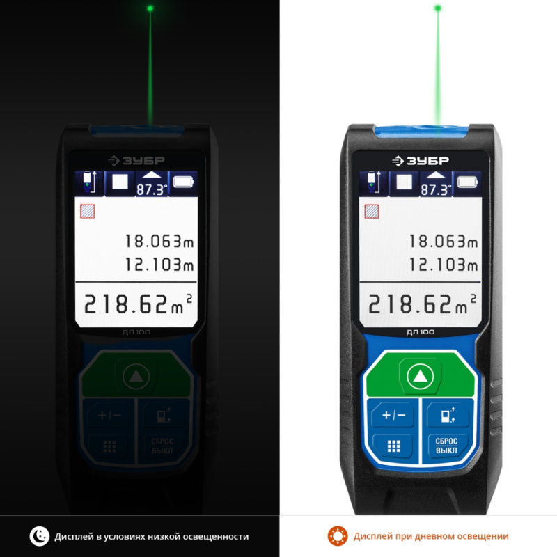 Лазерный дальномер Зубр ДЛ-100 2кл.лаз. 532нм цв.луч. зеленый в кейсе (34923)