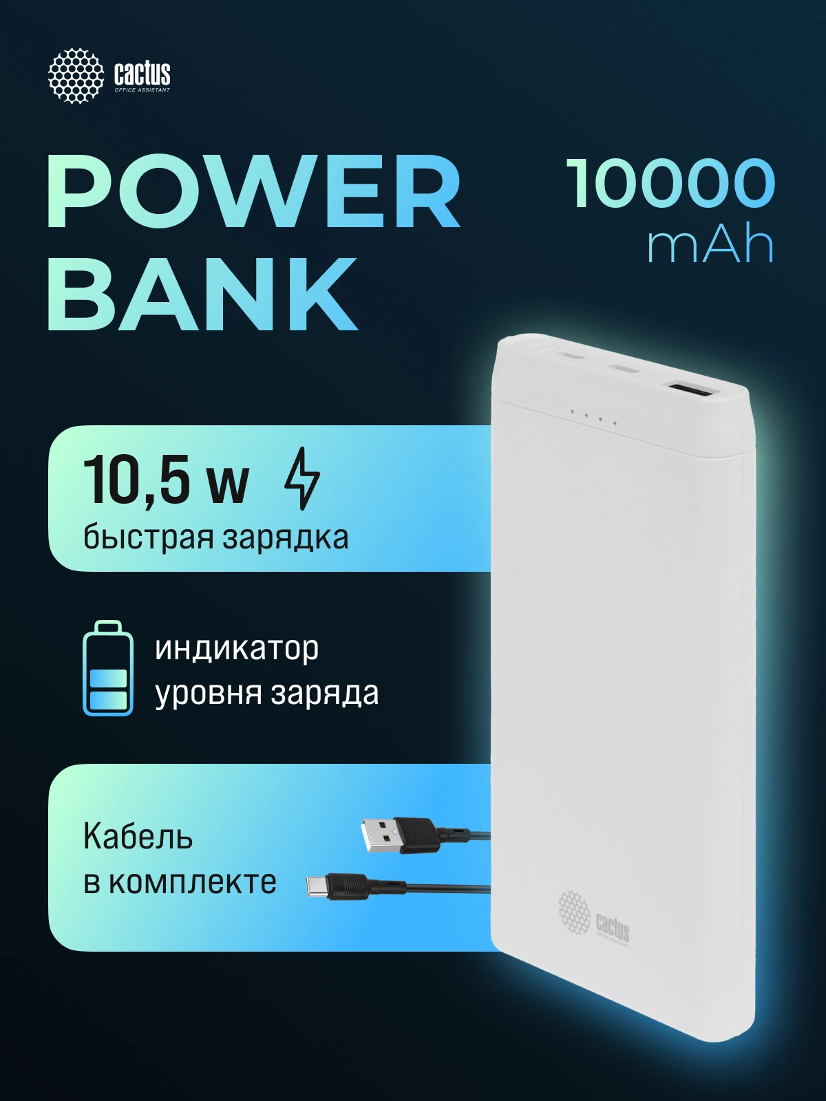 Мобильный аккумулятор Cactus CS-PBFSMT-10000 10000mAh 10.5W 2.1A 2xUSB-A белый