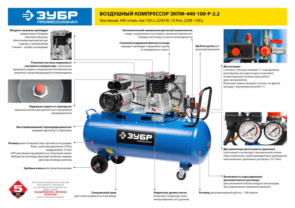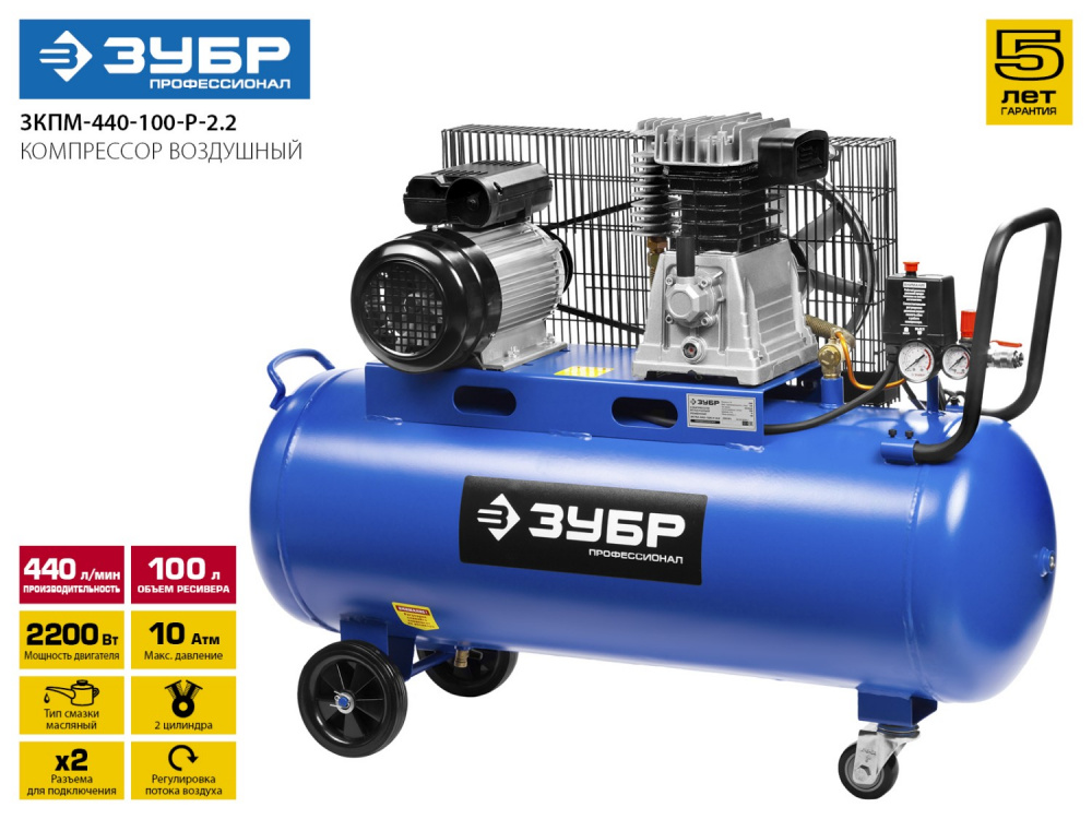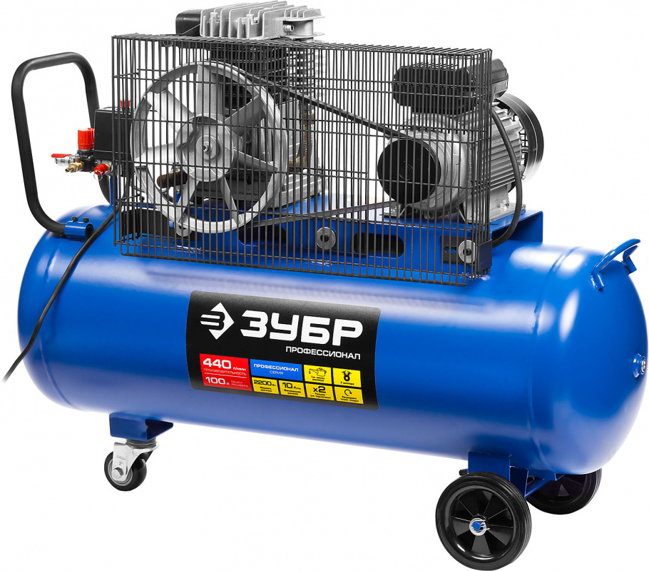 Компрессор поршневой Зубр Профессионал ЗКПМ-440-100-Р-2.2 масляный 440л/мин 100л 2200Вт