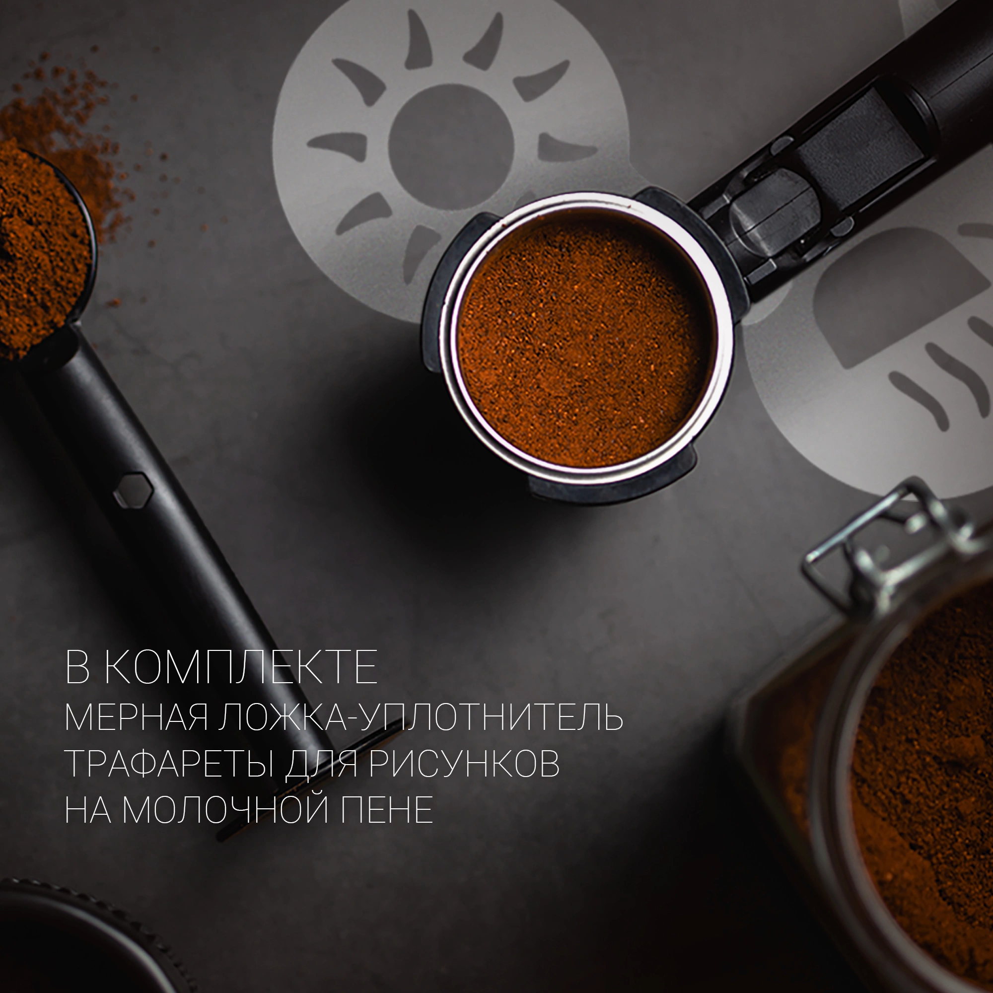 - ОсобенностиТрафареты для рисунков на молочной пене. Мерная ложка-уплотнитель в комплекте. Приспособление для очистки капучинатора. Съемный фильтр.