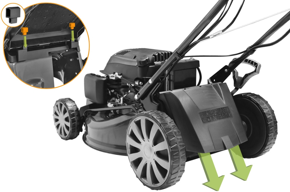 - Особенности устройствамульчирование, регулировка высоты скашивания, регулировка ручки по высоте, ручки для транспортировки, складная ручка