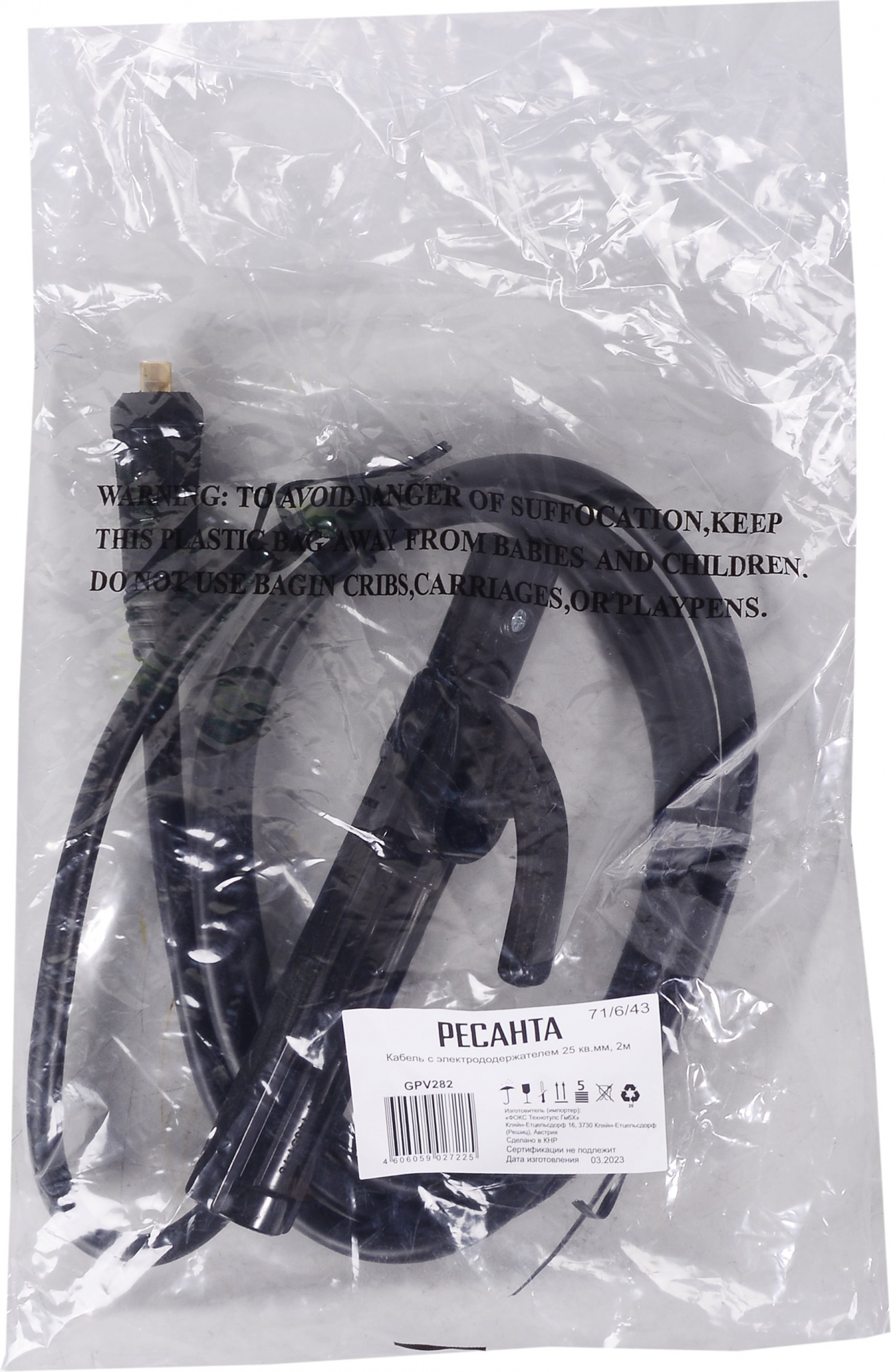 Кабель с электрододержателем Ресанта предназначен для фиксации электрода и подвода к нему тока во время сварочных работ методом MMA. Электропроводящие части изолированы от случайного прикосновения. Длина - 2 м. Сечение кабеля - 25 мм2. Материал - медь.