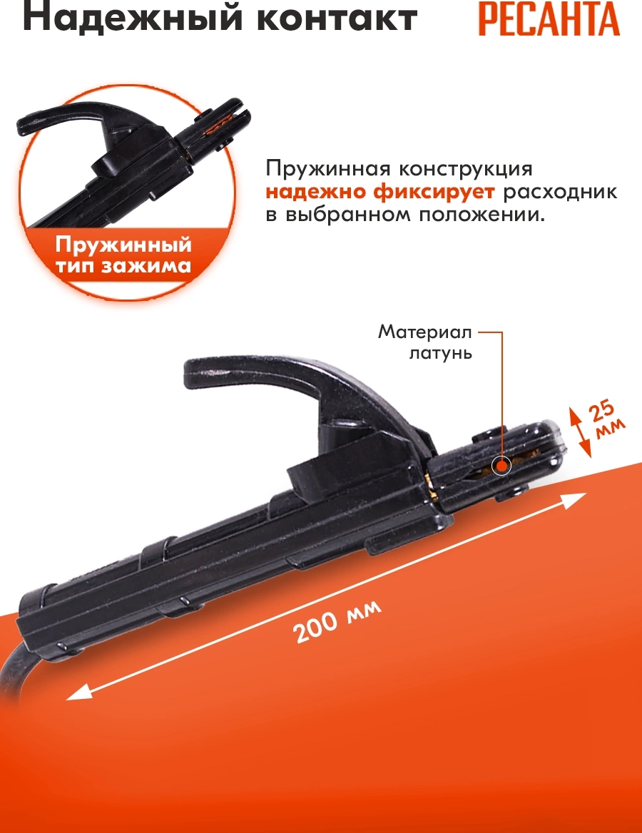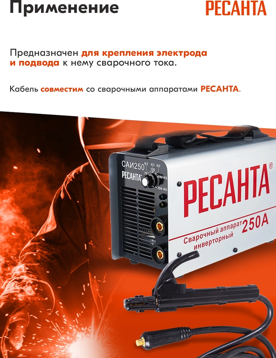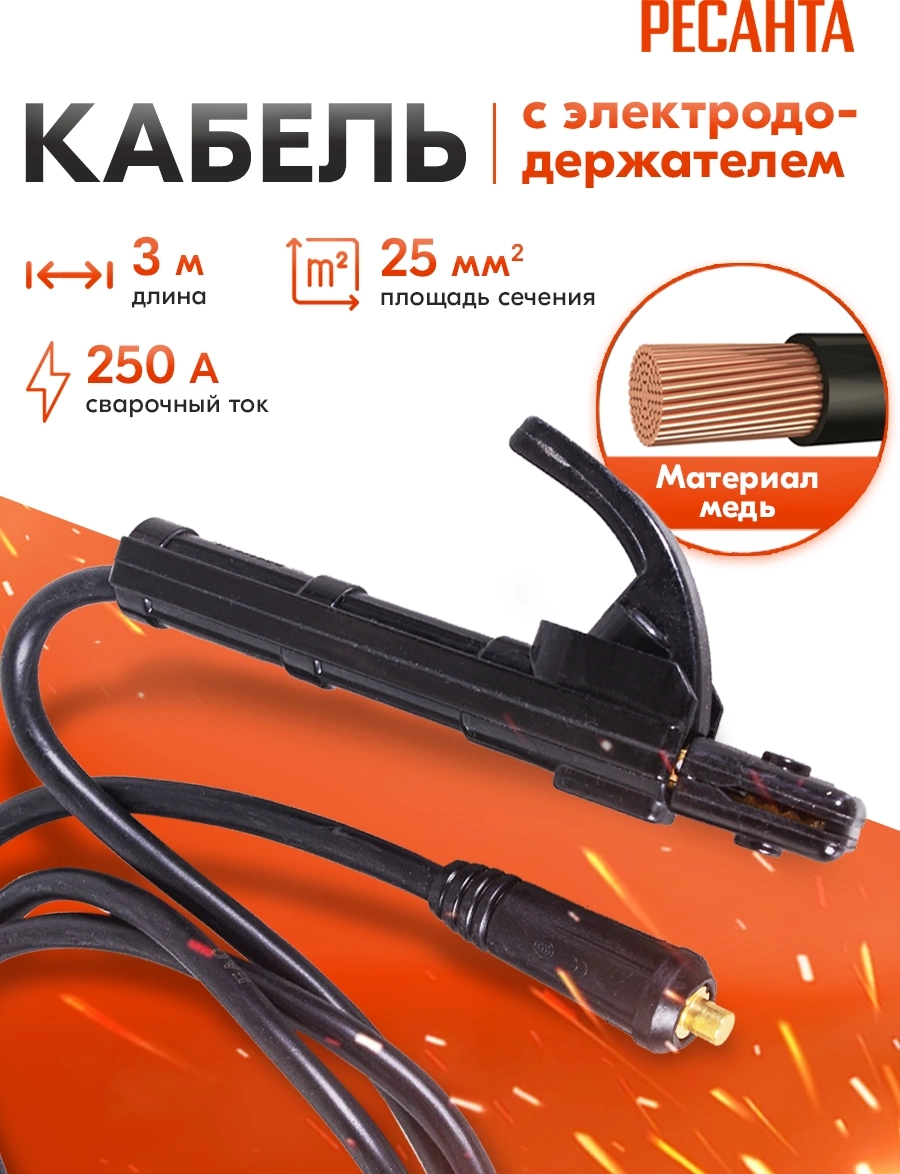 Кабель с электрододержателем Ресанта предназначен для фиксации электрода и подвода к нему тока во время сварочных работ методом MMA. Электропроводящие части изолированы от случайного прикосновения. Длина - 3 м. Сечение кабеля - 25 мм2. Материал - медь.