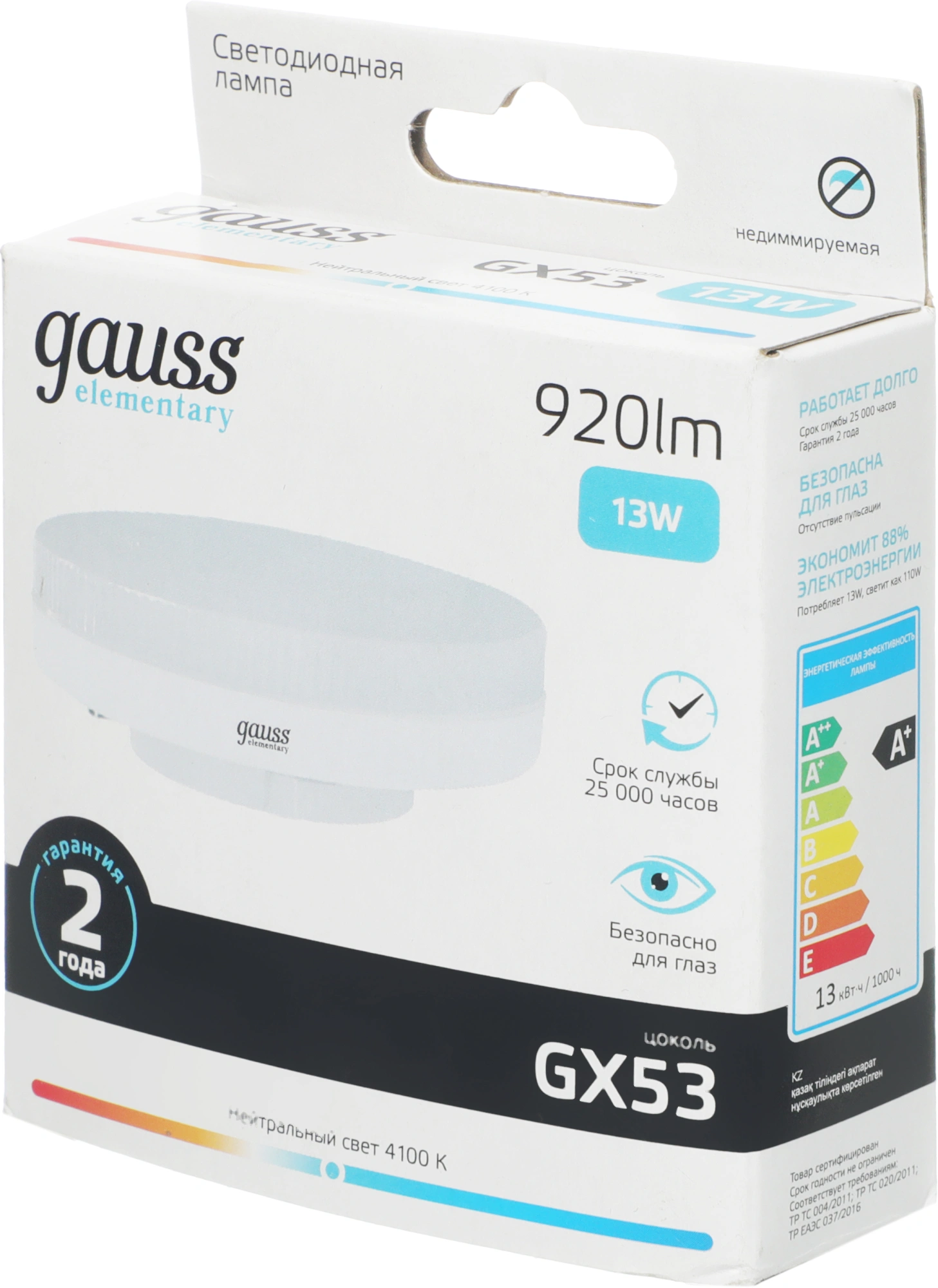 Лампа светодиодная Gauss Elementary GX53 13Вт цок.:GX53 таблетка 220B св.свеч.бел.нейт. Tablet (упак.:1шт) (83823)