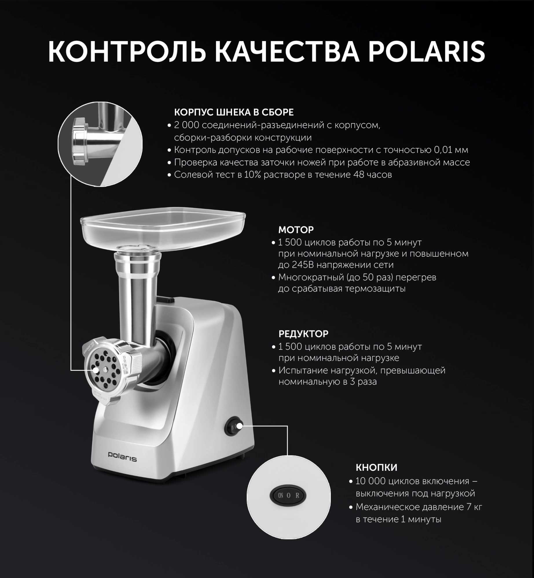 Компактная универсальная мясорубка Polaris PMG 2077 RUS оснащена надежным мотором мощностью 2000 Вт, что обеспечивает высокую производительность прибора: до 2-х кг мяса в минуту. Благодаря небольшим габаритам, найти место для ее хранения будет совсем не сложно.