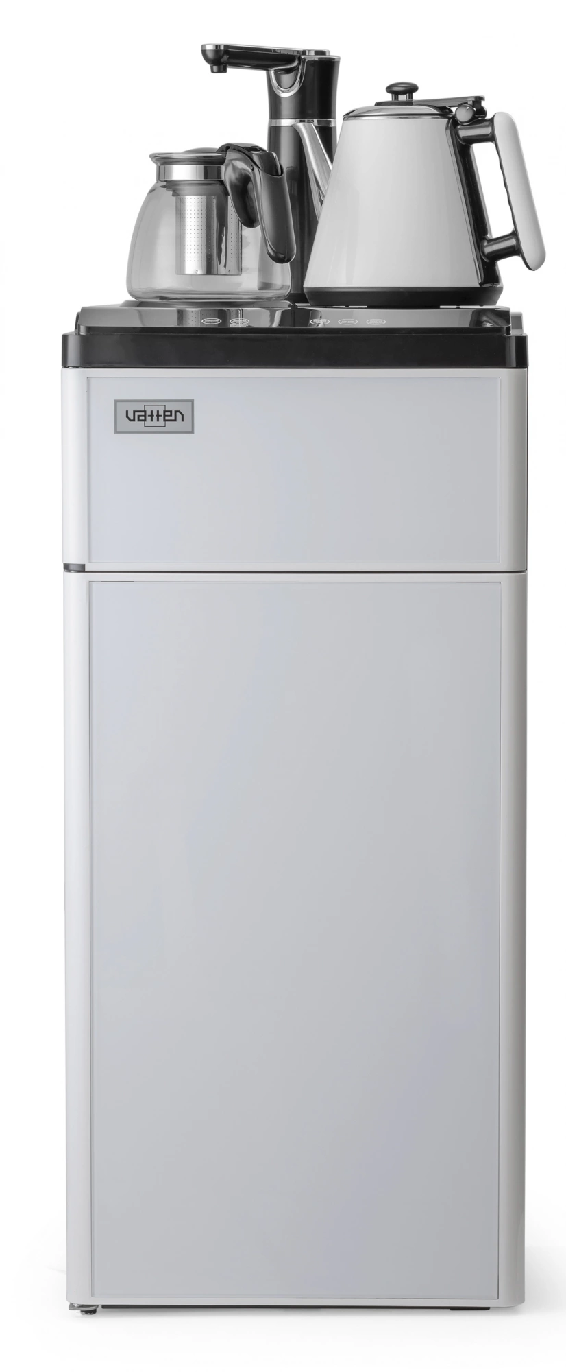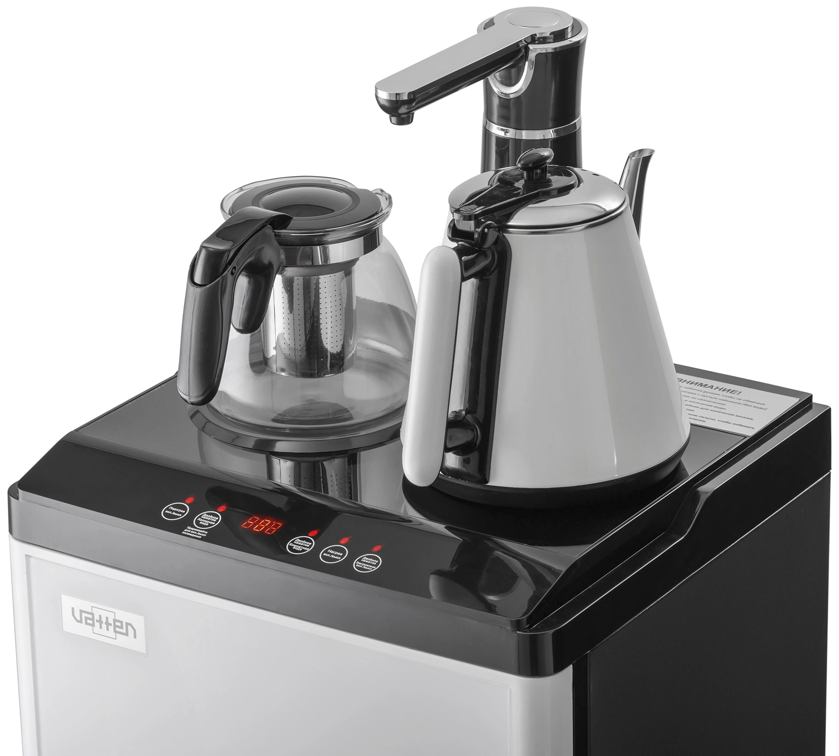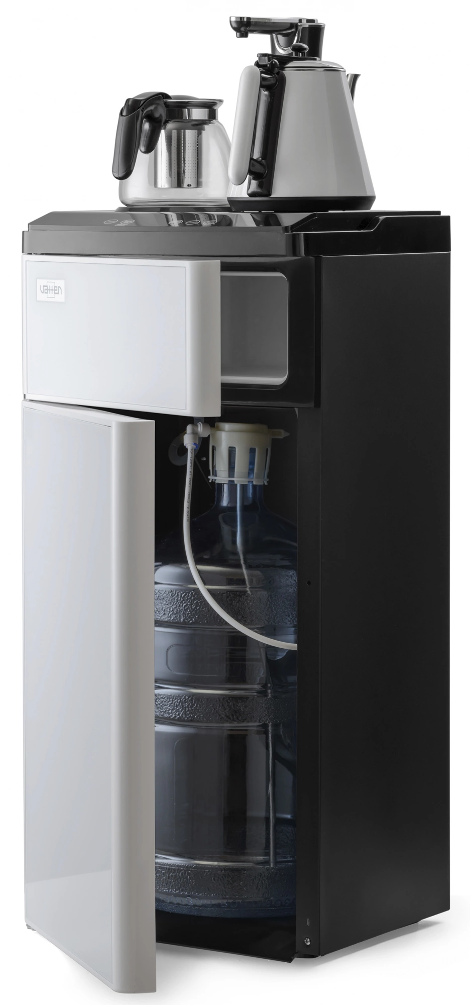 Кулер с нижней загрузкой бутыли сделанный по схеме tea bar (чайный столик - тиабар). Подача воды осуществляется через кран, установленный в верхней части аппарата.Кулер оснащен двумя чайниками: для заварки чая и для кипячения воды.