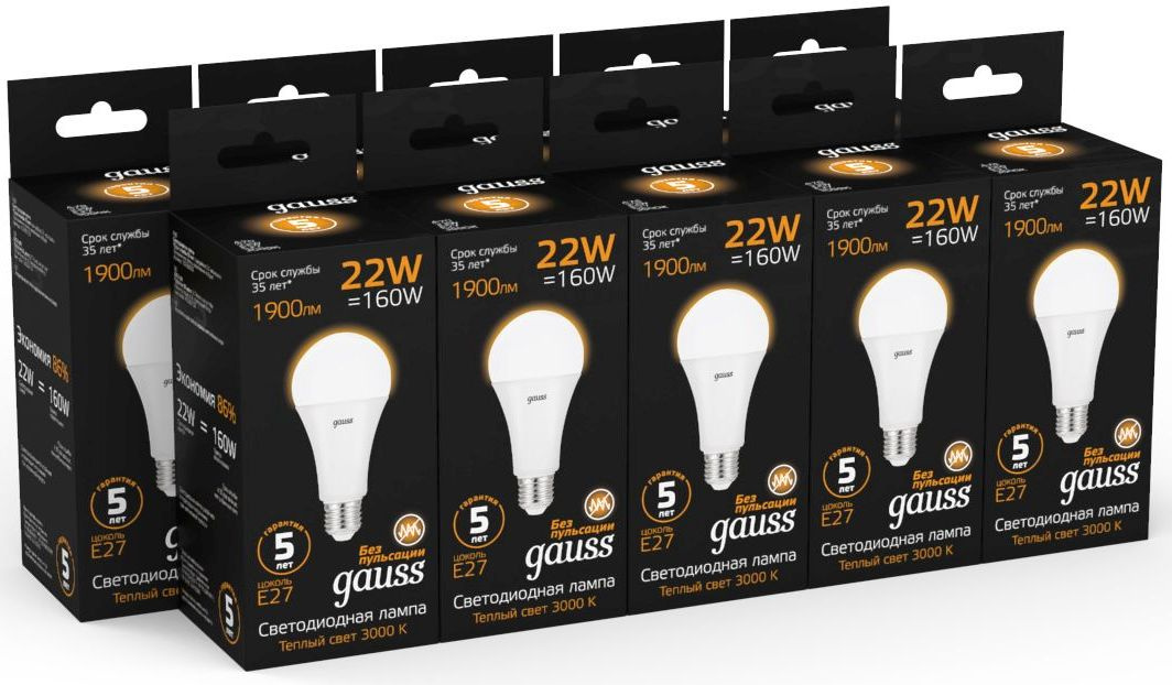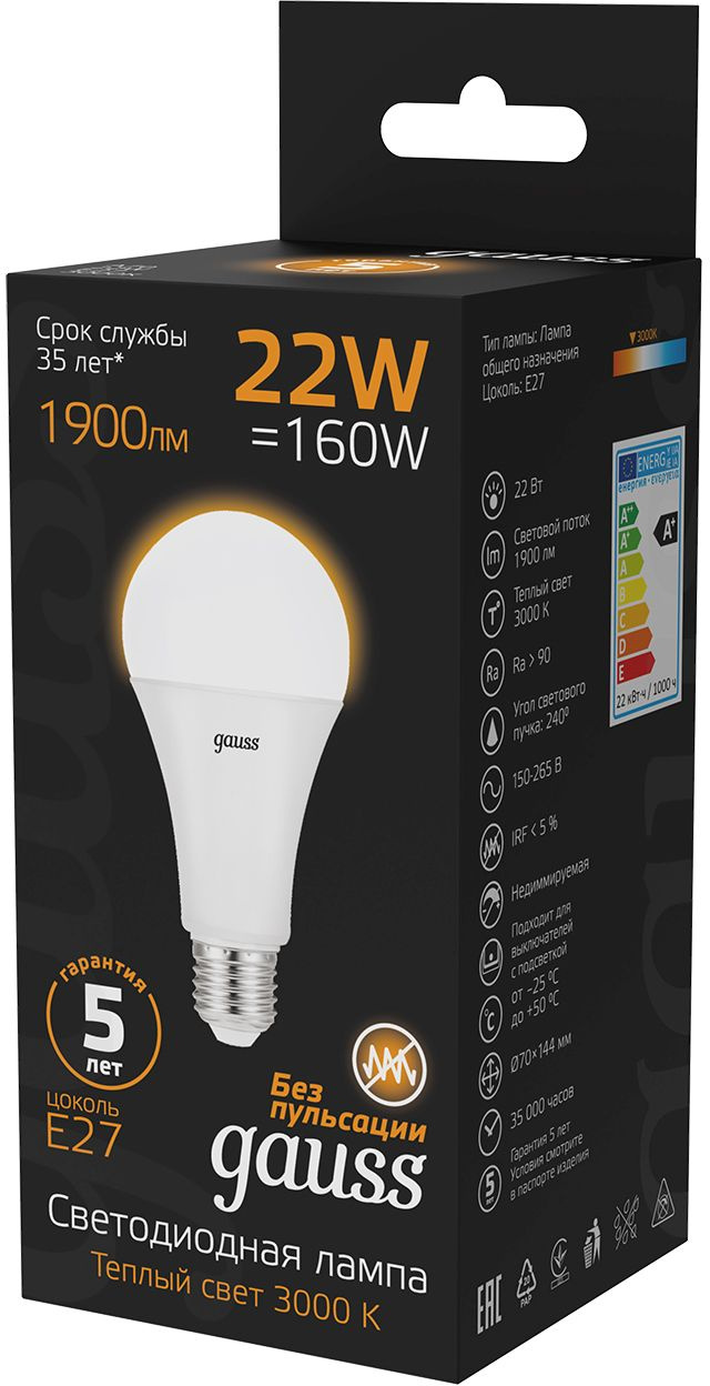 Лампа светодиодная Gauss A70 22Вт цок.:E27 груша 220B св.свеч.бел.теп. (упак.:1шт) (102502122)
