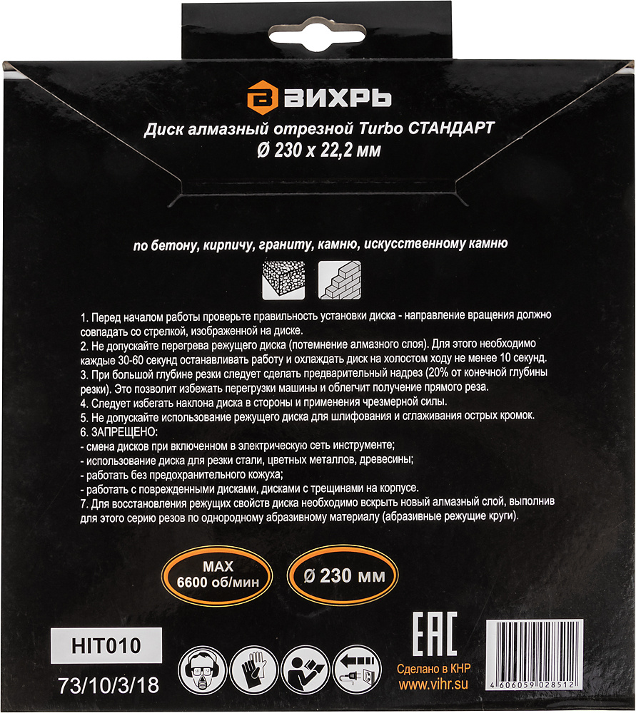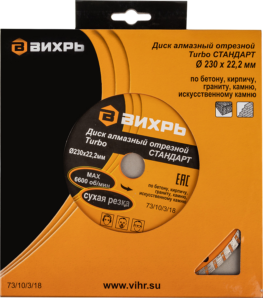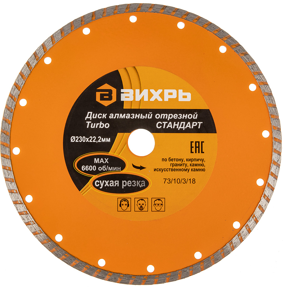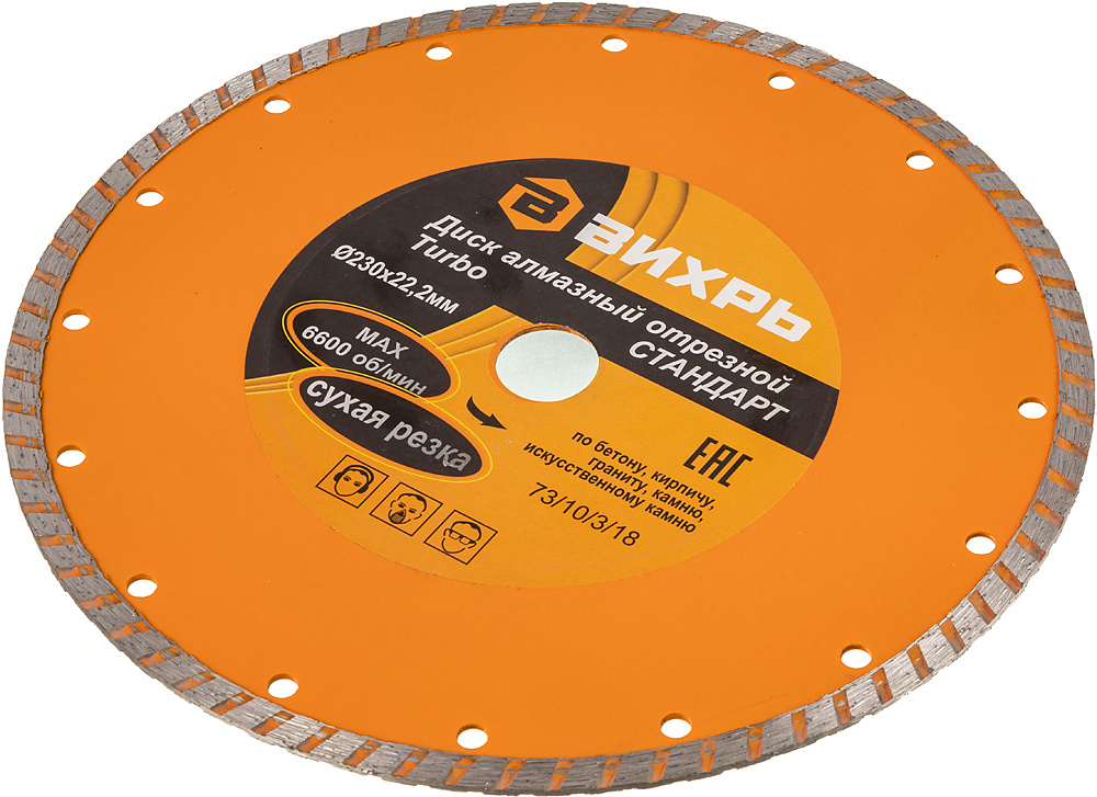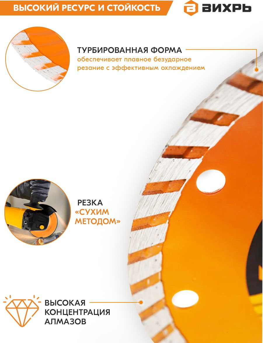Диск алмазный отрезной Турбо СТАНДАРТ, 230 х 22,2 мм, сухая резка Вихрь - это алмазный отрезной диск, который используется совместно с угловыми шлифмашинами (болгарками) для сухой резки гранитных, бетонных, кирпичных и каменных изделий.