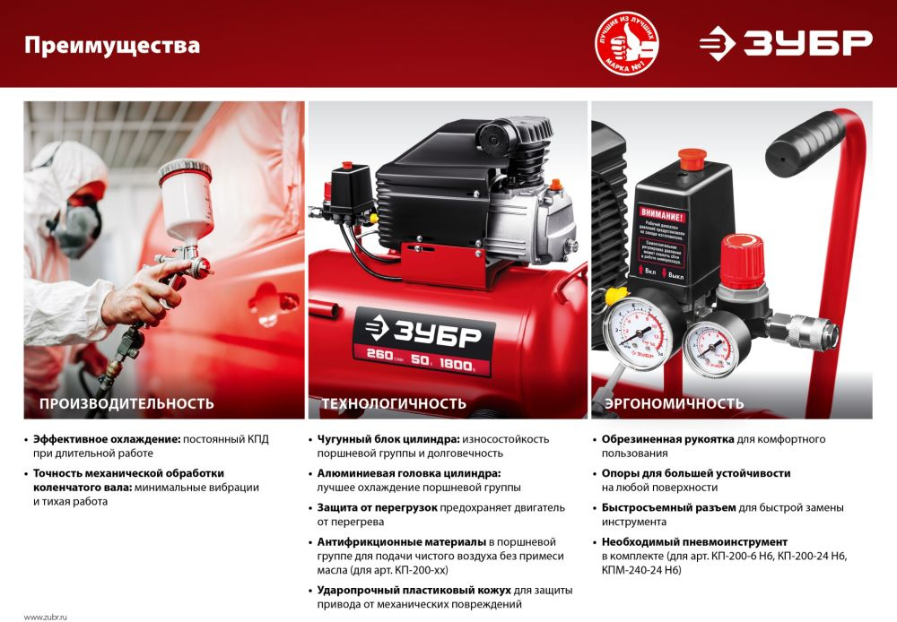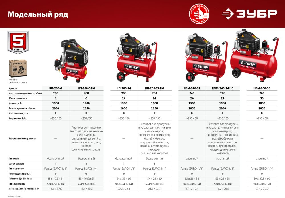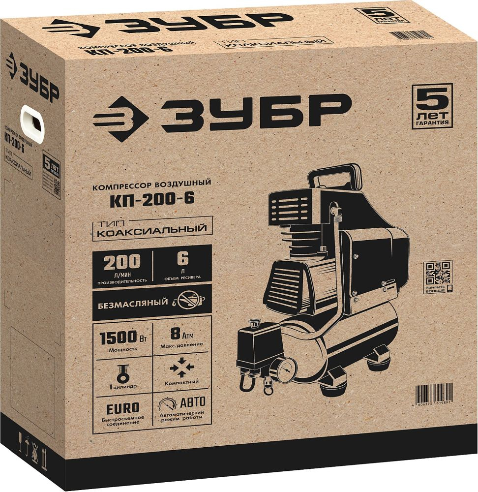 Компрессор поршневой Зубр КП-200-6 безмасляный 200л/мин 6л 1500Вт красный