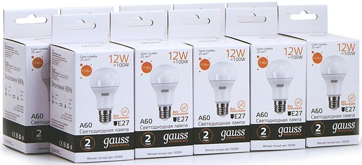 Лампа светодиодная Gauss Elementary 12Вт цок.:E27 груша 220B 3000K св.свеч.бел.теп. A60 (упак.:10шт) (23212)