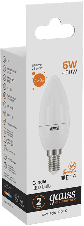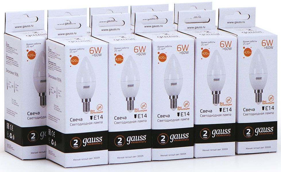Светодиодная лампа Gauss - безопасный для здоровья и окружающей среды источник света. Она не пульсирует, мгновенно включается, не содержит ртути и имеет больший срок службы, чем лампы накаливания и КЛЛ, экономичнее ламп накаливания до 10 раз.