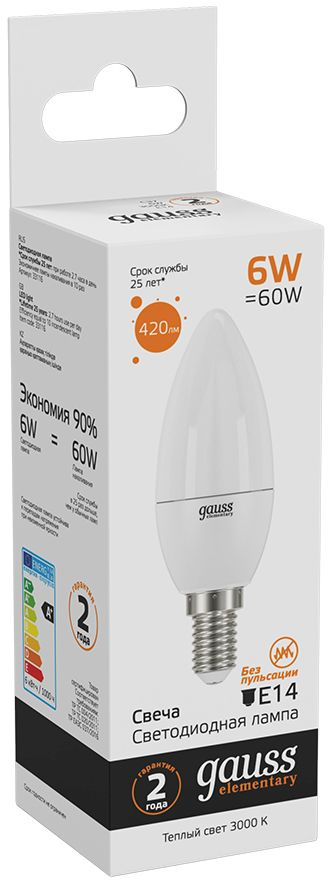 Лампа светодиодная Gauss Elementary 6Вт цок.:E14 свеча 220B св.свеч.бел.теп. C37 (упак.:10шт) (33116)