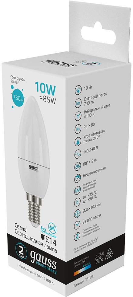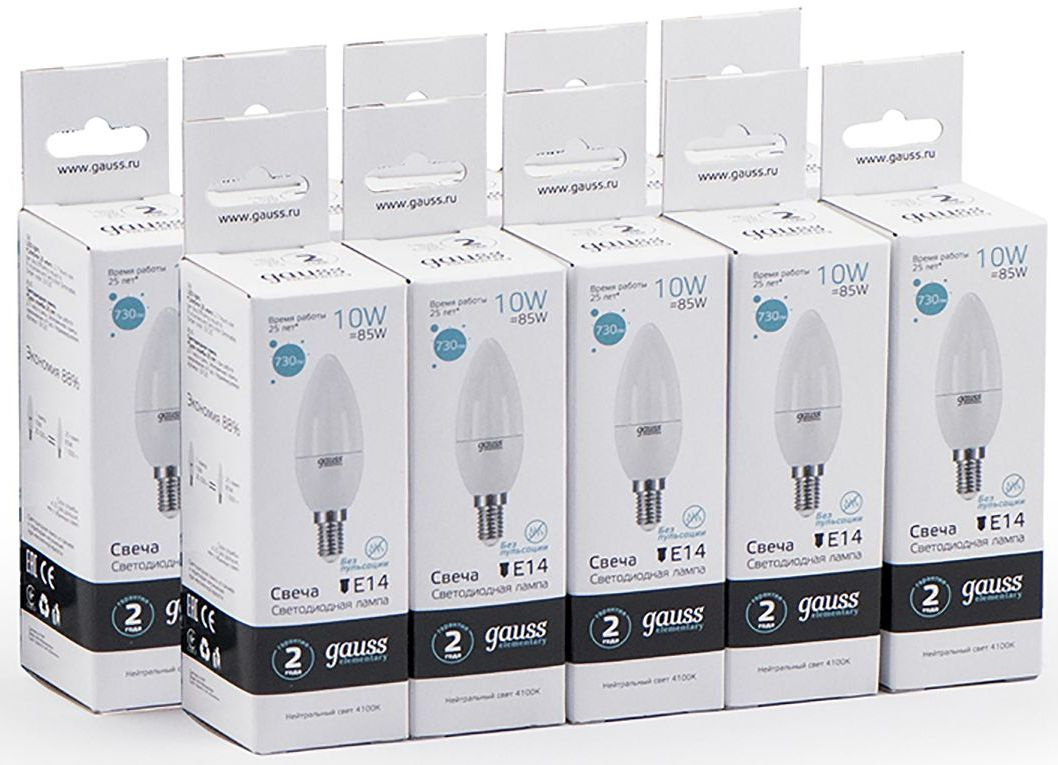 Лампа светодиодная Gauss Elementary 10Вт цок.:E14 свеча 220B 4100K св.свеч.бел.нейт. C37 (упак.:10шт) (33120)