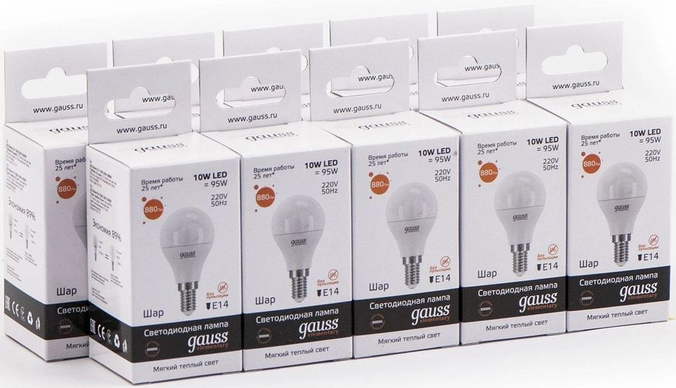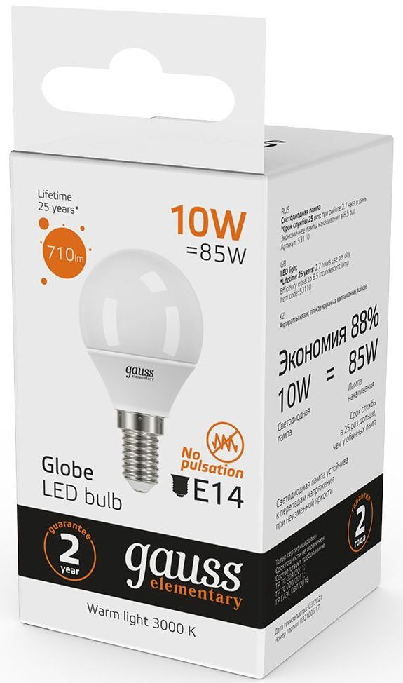 Светодиодная лампа Gauss - безопасный для здоровья и окружающей среды источник света. Она не пульсирует, мгновенно включается, не содержит ртути и имеет больший срок службы, чем лампы накаливания и КЛЛ, экономичнее ламп накаливания до 10 раз.