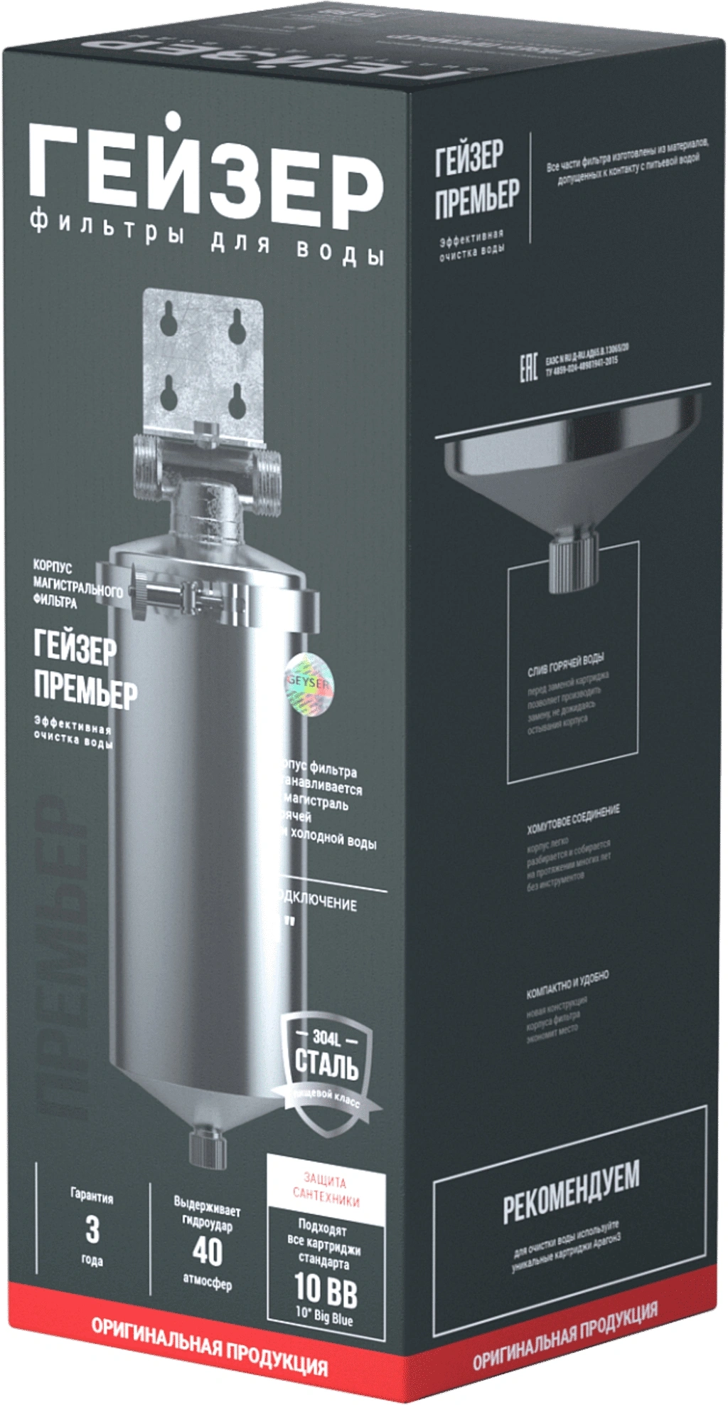 Премьер 10BB устанавливается на вход в систему горячего или холодного водоснабжения. Корпус фильтра изготовлен из высококачественной нержавеющей стали марки 304L, устойчивой к возникновению коррозии, что гарантирует многолетнюю работу фильтра. Используется с картриджами стандарта Big Blue 10".