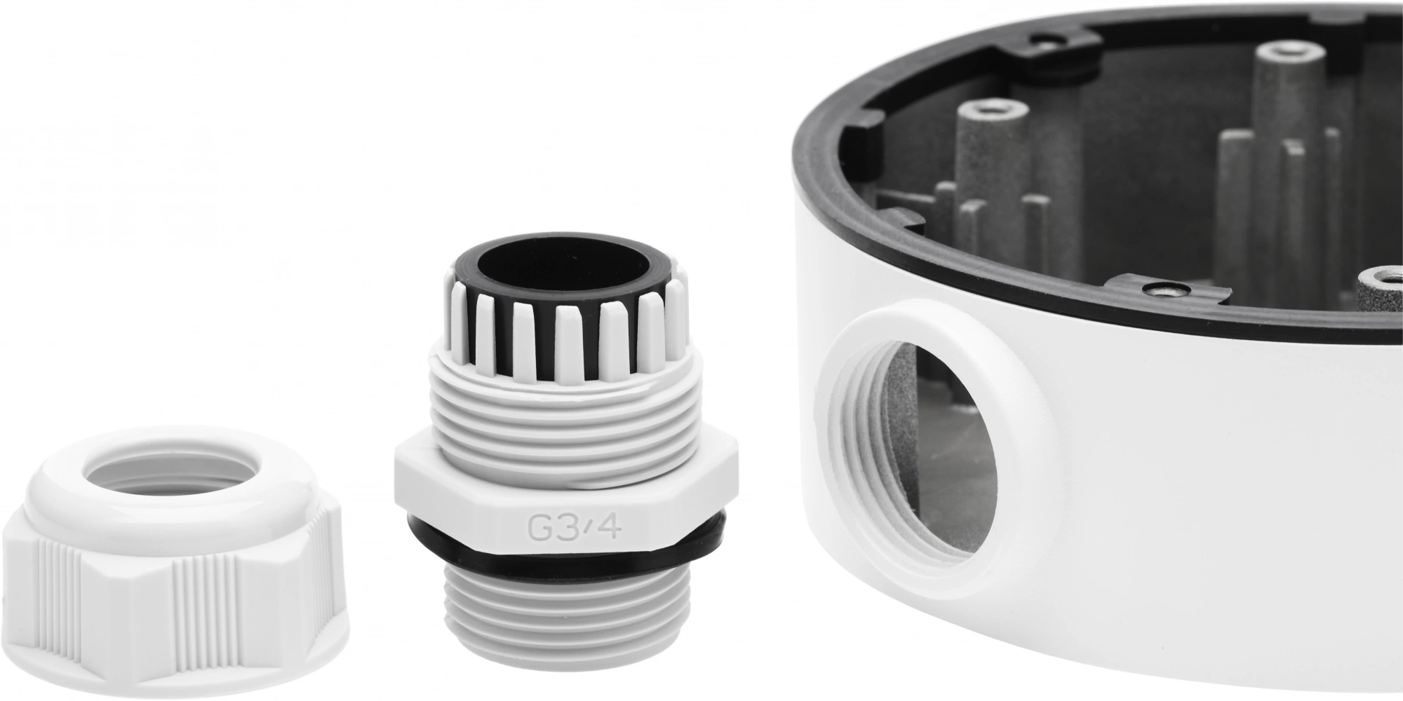 Корпус из алюминиевого сплава, поверхность обработана напылением. Оснащена выходами на нижней и боковой сторонах. Подходит для установки в помещении и на улице