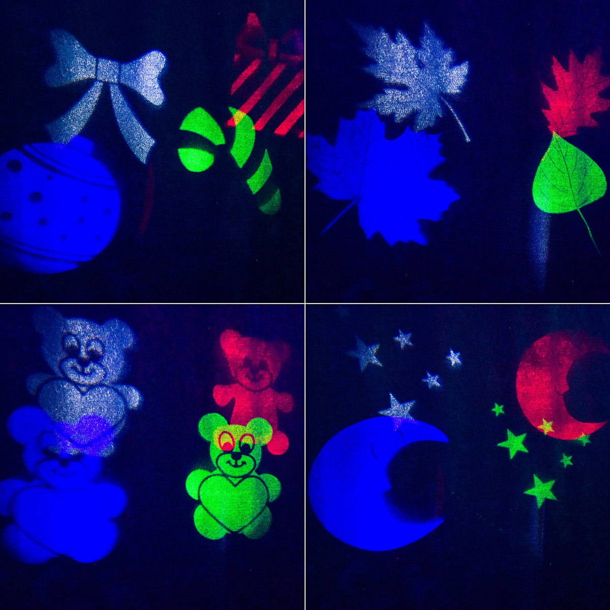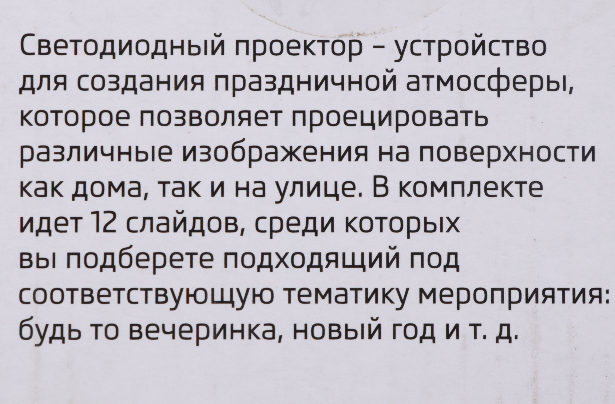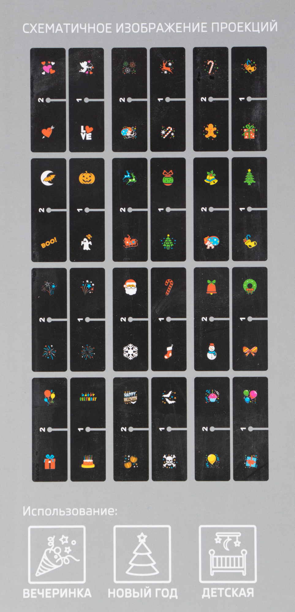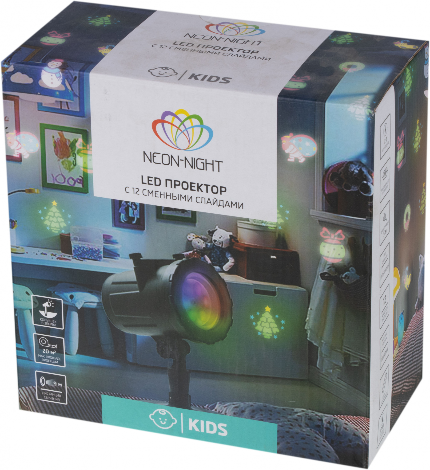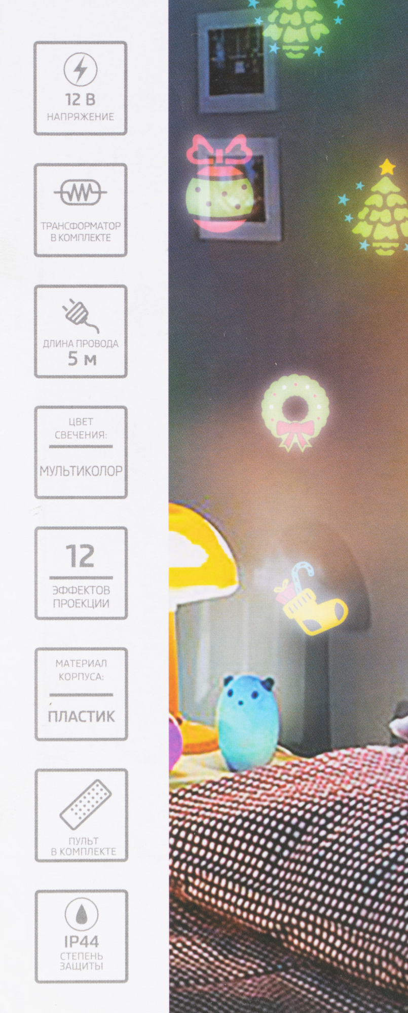 Проектор-ночник используется для создания вечеринки и уютной атмосферы в детской комнате. Новогодние разноцветные слайды (всего 12) отражаются на стенах, потолке и мебели. Прибор бесшумен и безопасен благодаря понижающему трансформатору - в комплекте. Рекомендуемое расстояние для проекции: до 5 м.