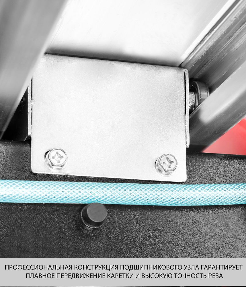 - ОсобенностиПодвижная головка диска способствует большей безопасности и удобству в работе, т.к. отсутствует необходимость "протягивать" плитку через диск; Профессиональная конструкция подшипникового узла гарантирует плавное передвижение каретки и высокую точность реза
