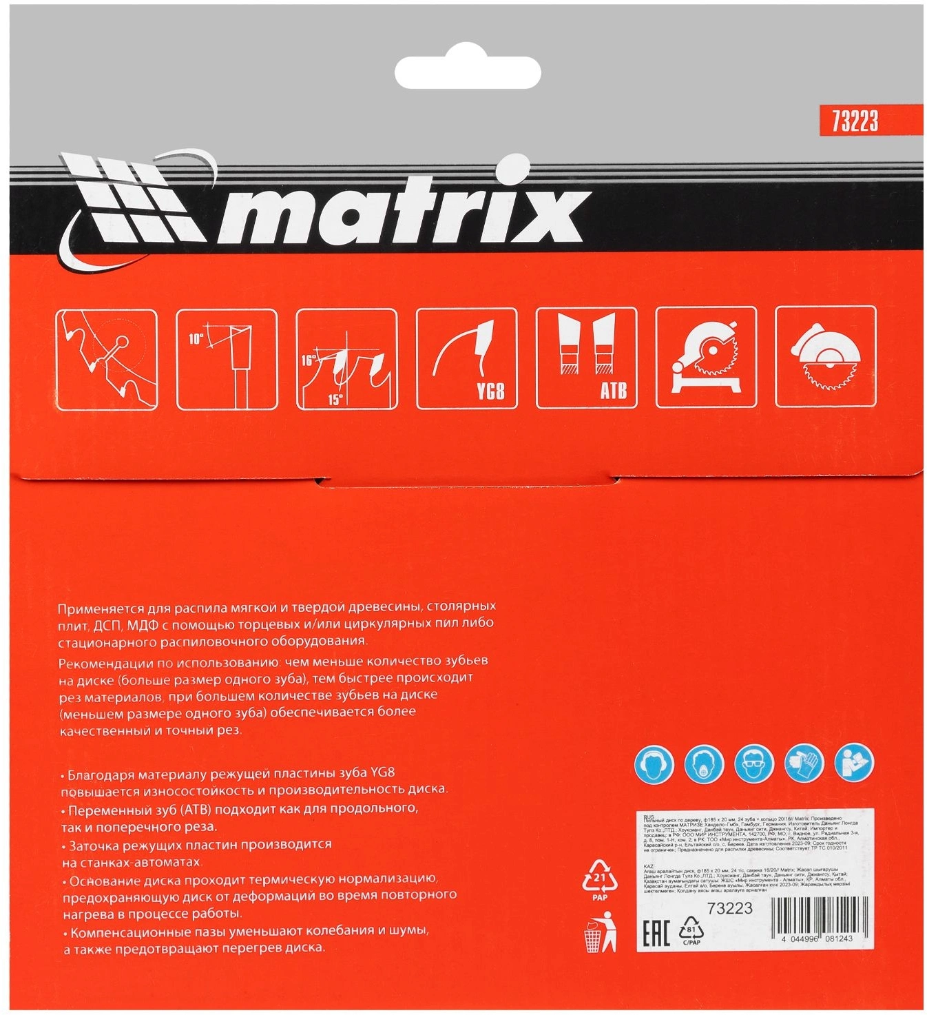 Диск Matrix Professional предназначен для продольного и поперечного распила древесины. Корпус диска шлифованный, изготовлен из стали 65Г и термонормализован. Зубья из ВК8 припаяны высокопрочным припоем. Алмазная заточка с выхаживанием значительно увеличивает срок службы инструмента.