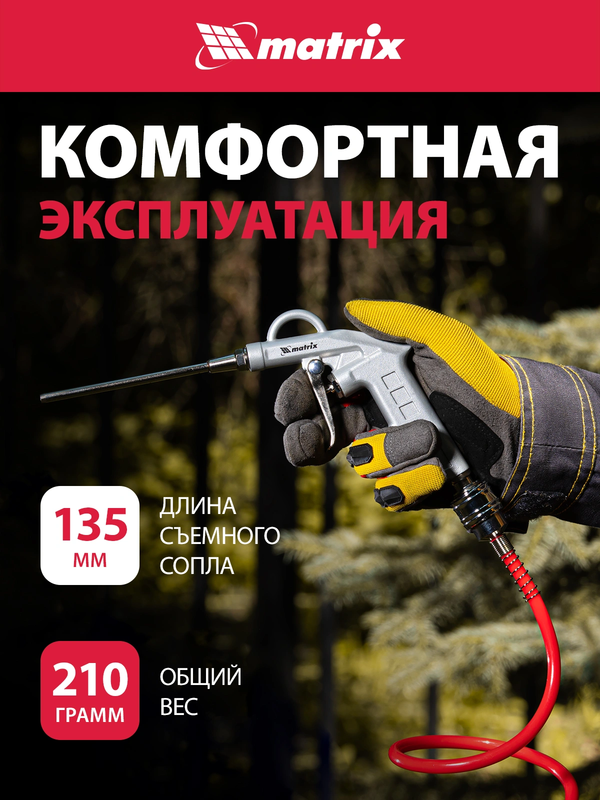 Удлиненное сопло позволяет производить работы в труднодоступных местах. Инструмент предназначен для продувки сжатым воздухом малых отверстий и больших поверхностей.