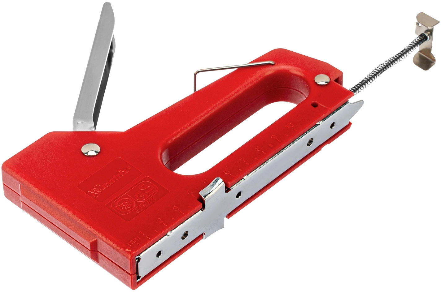 - ОсобенностиИзносостойкий ударопрочный ABS-пластик корпуса. Ручка фиксируется петлей для исключения случайного выстрела скобы.