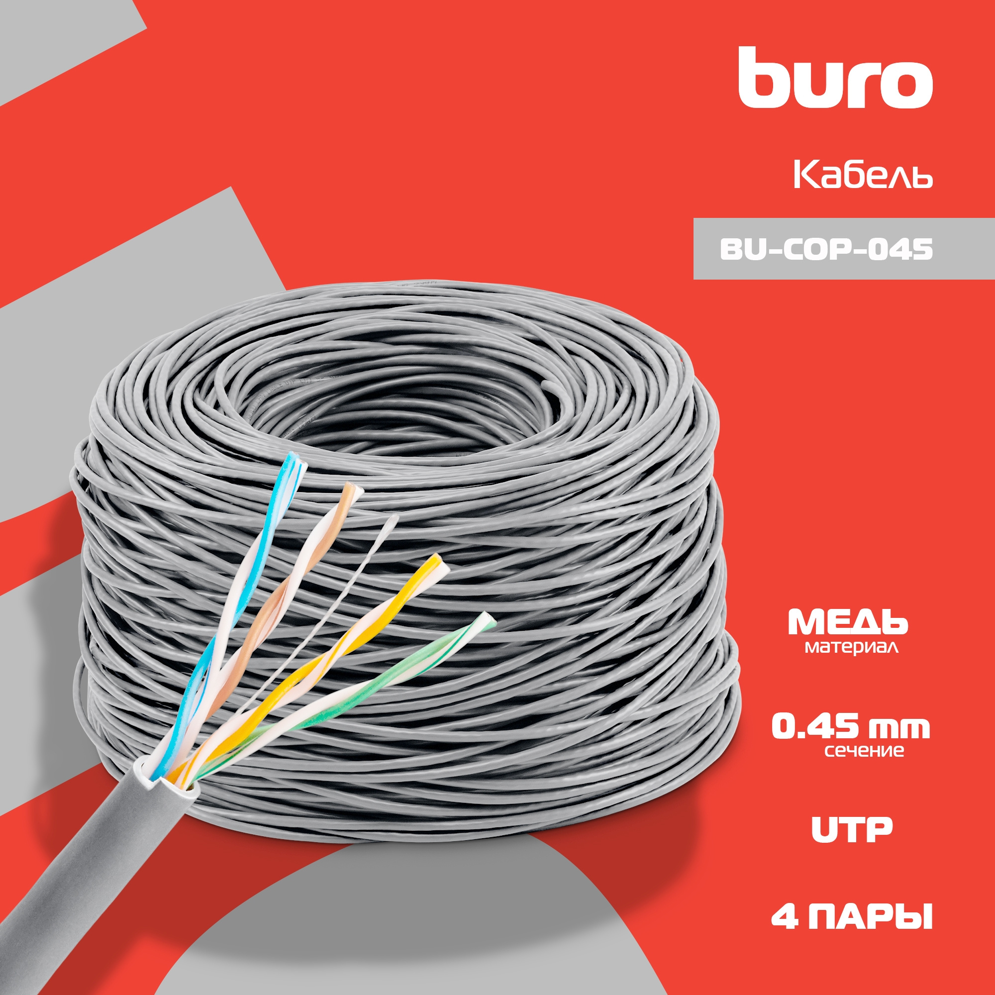 Кабель сетевой Buro BU-COP-045 UTP 4 пары cat.5E solid 0.45мм Cu 305м серый