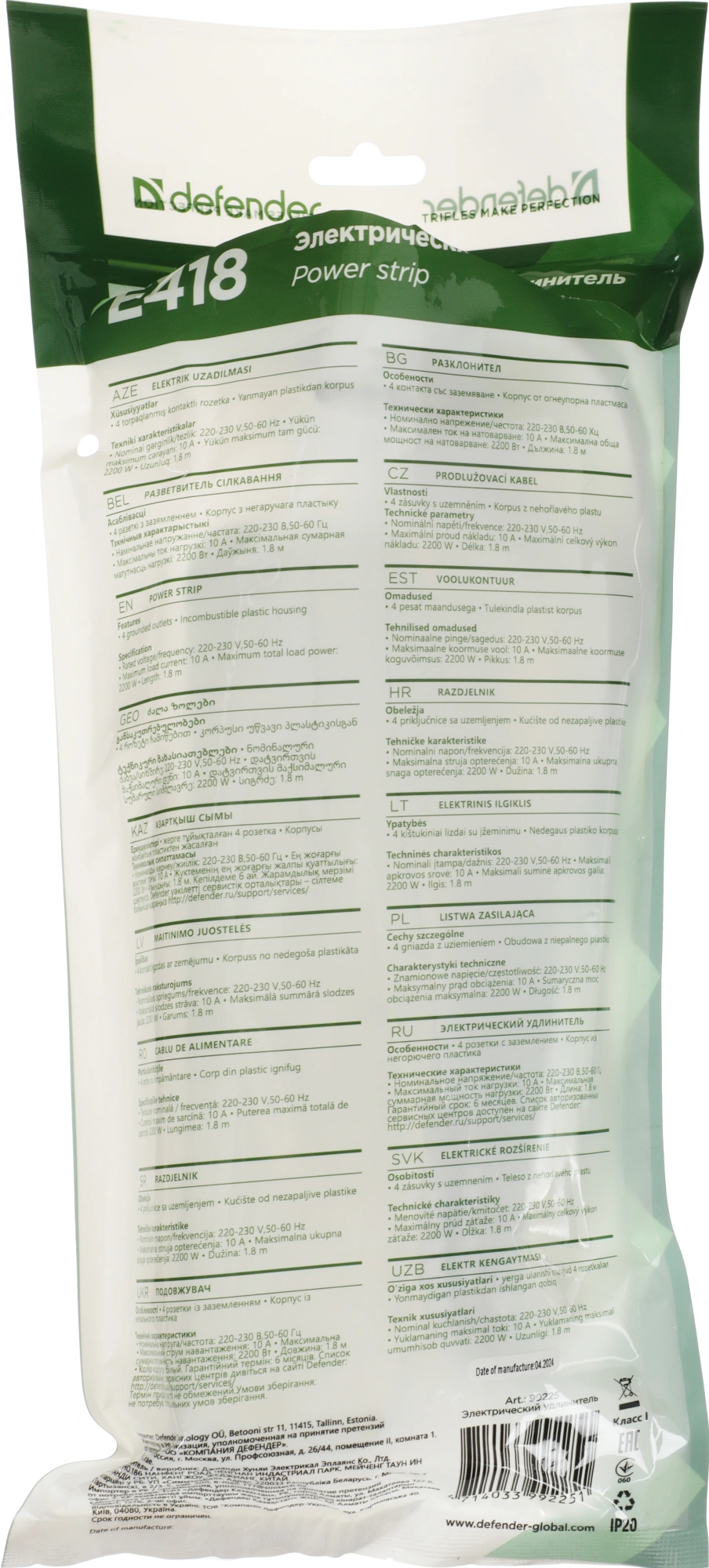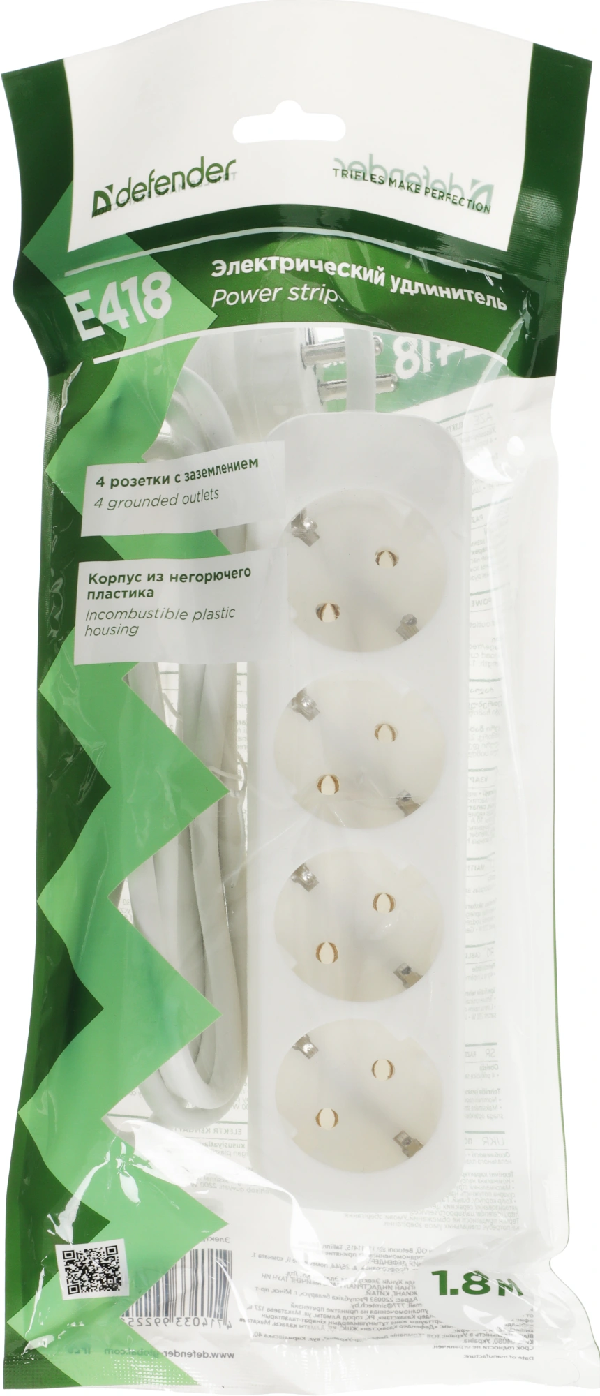 Сетевой удлинитель Defender E418 1.8м (4 розетки) белый (пакет ПЭ)