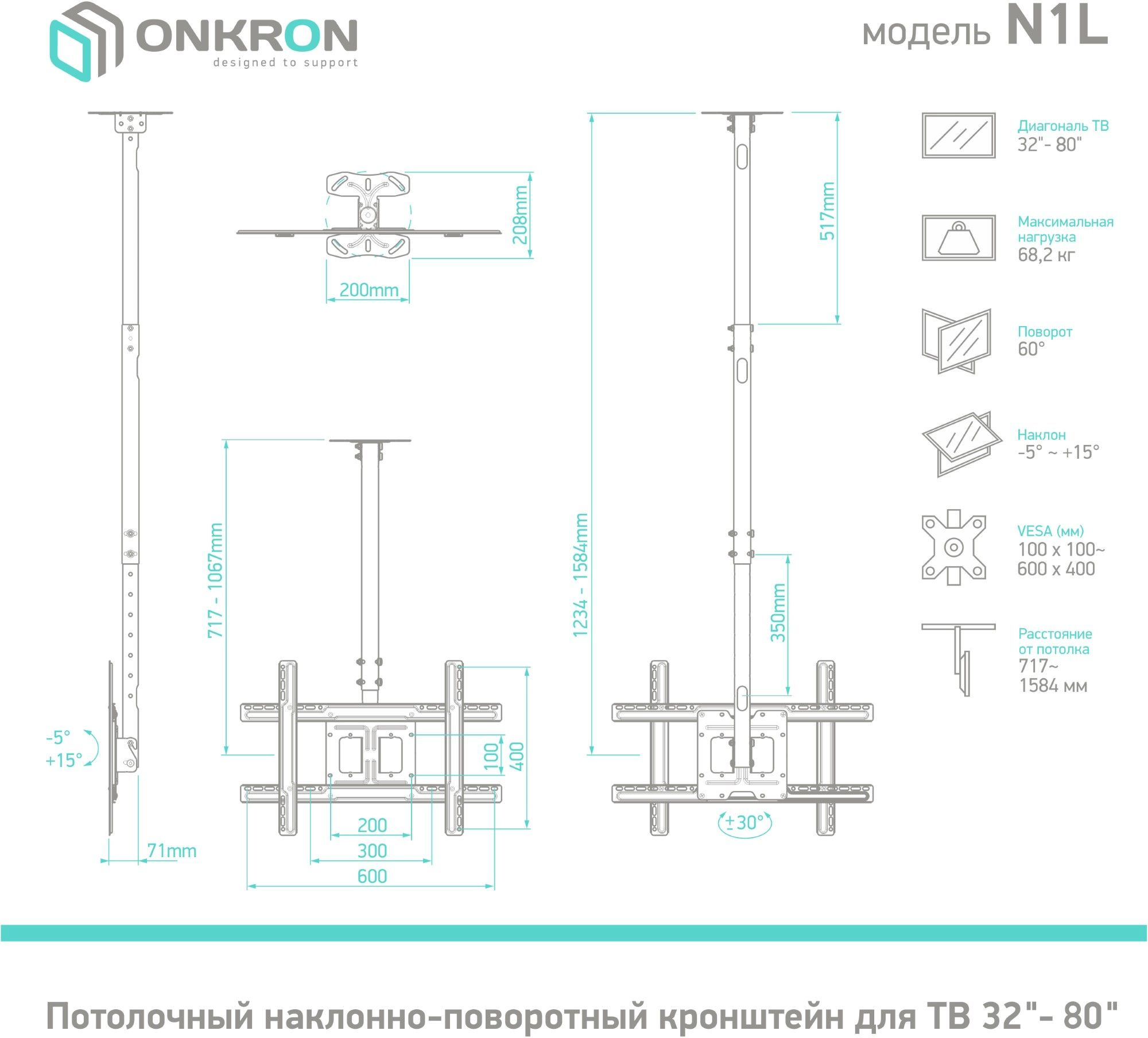 Потолочный кронштейн для ТВ ONKRON N1L предназначен для панелей с диагональю экрана от 32 до 80 дюймов. Максимальный выдерживаемый вес составляет 68,2 кг, что делает кронштейн подходящим для средних и больших digital-панелей.