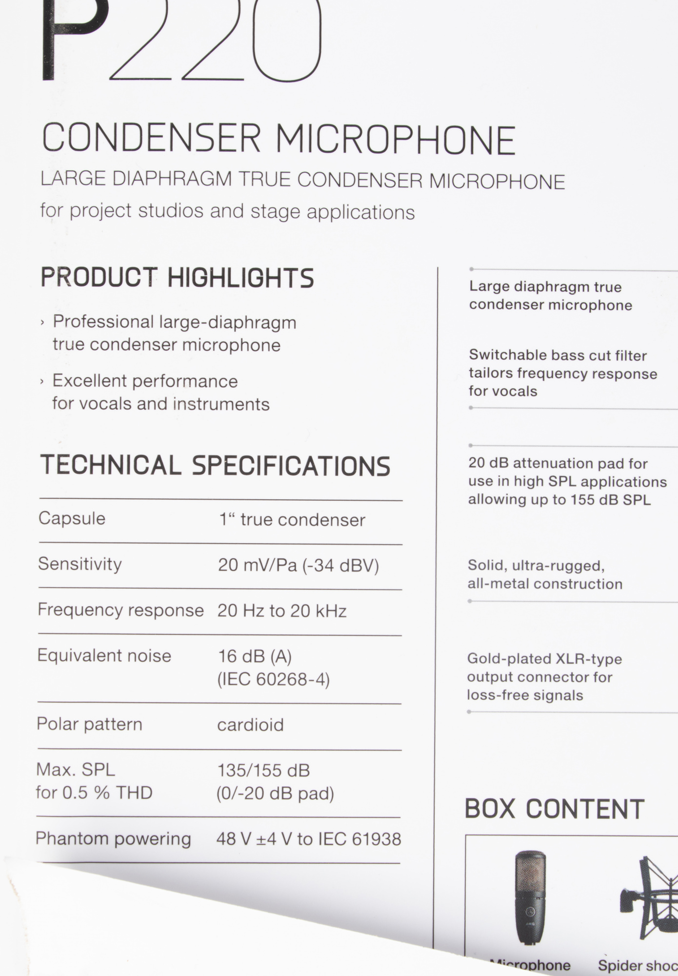 - ОсобенностиPerception 220 - это конденсаторный микрофон с большой диафрагмой, качественной сборкой и широкой применимостью. Переключаемый постоянный преаттенюатор и басовый обрезной фильтр позволяют использовать микрофон на источниках громкого звука, обеспечивающих уровни звукового давления до 155 dB SPL.