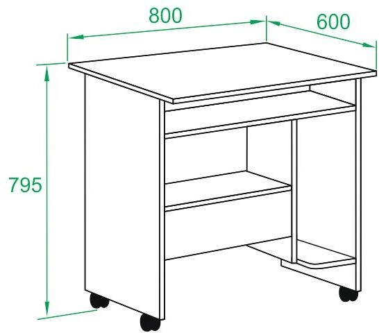 - ОсобенностиКомпактный компьютерный стол на колесиках подойдет для работы как за ноутбуком, так и за полноценным компьютером. На внутренних полочках можно удобно расположить системный блок и даже небольшой принтер.