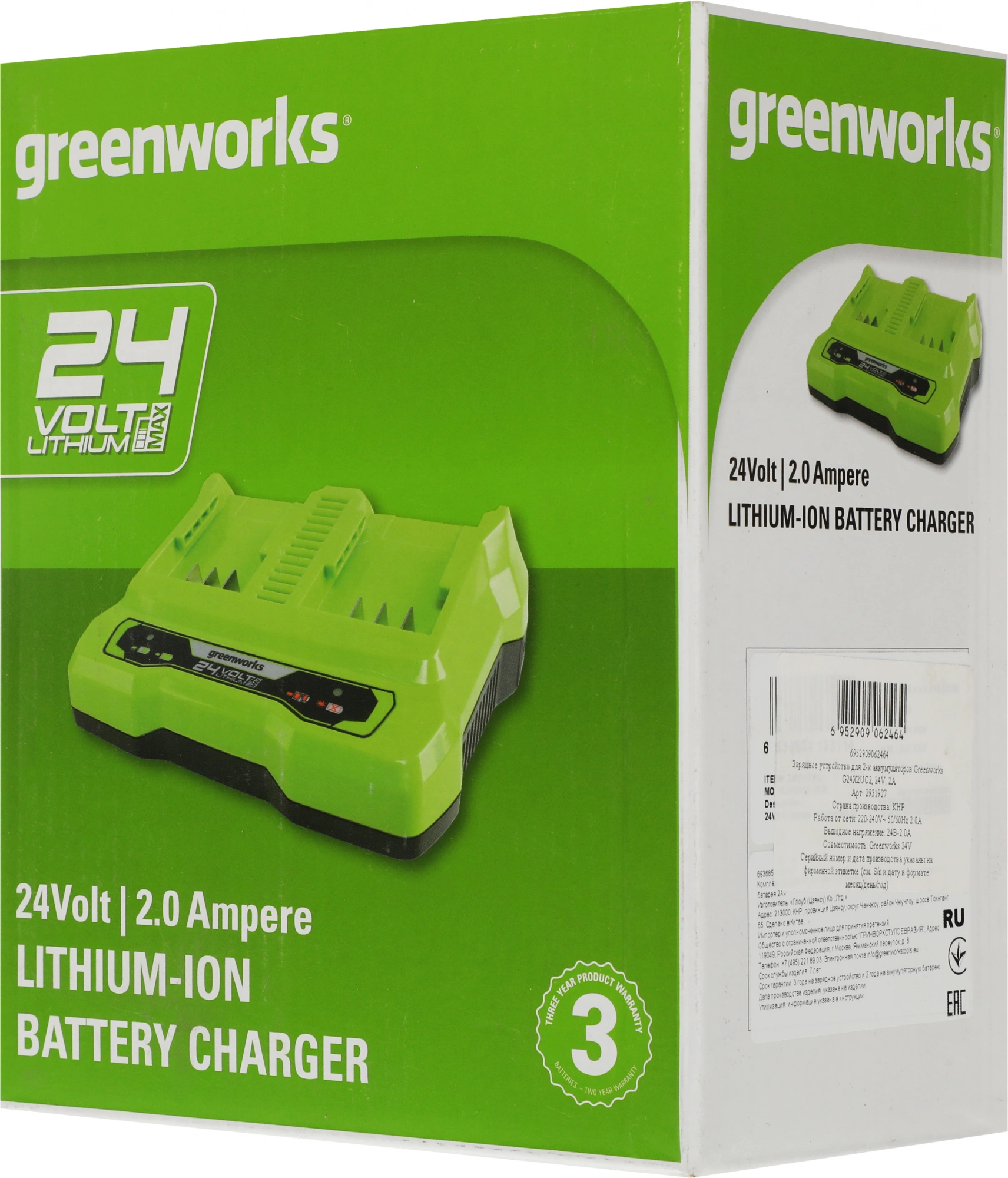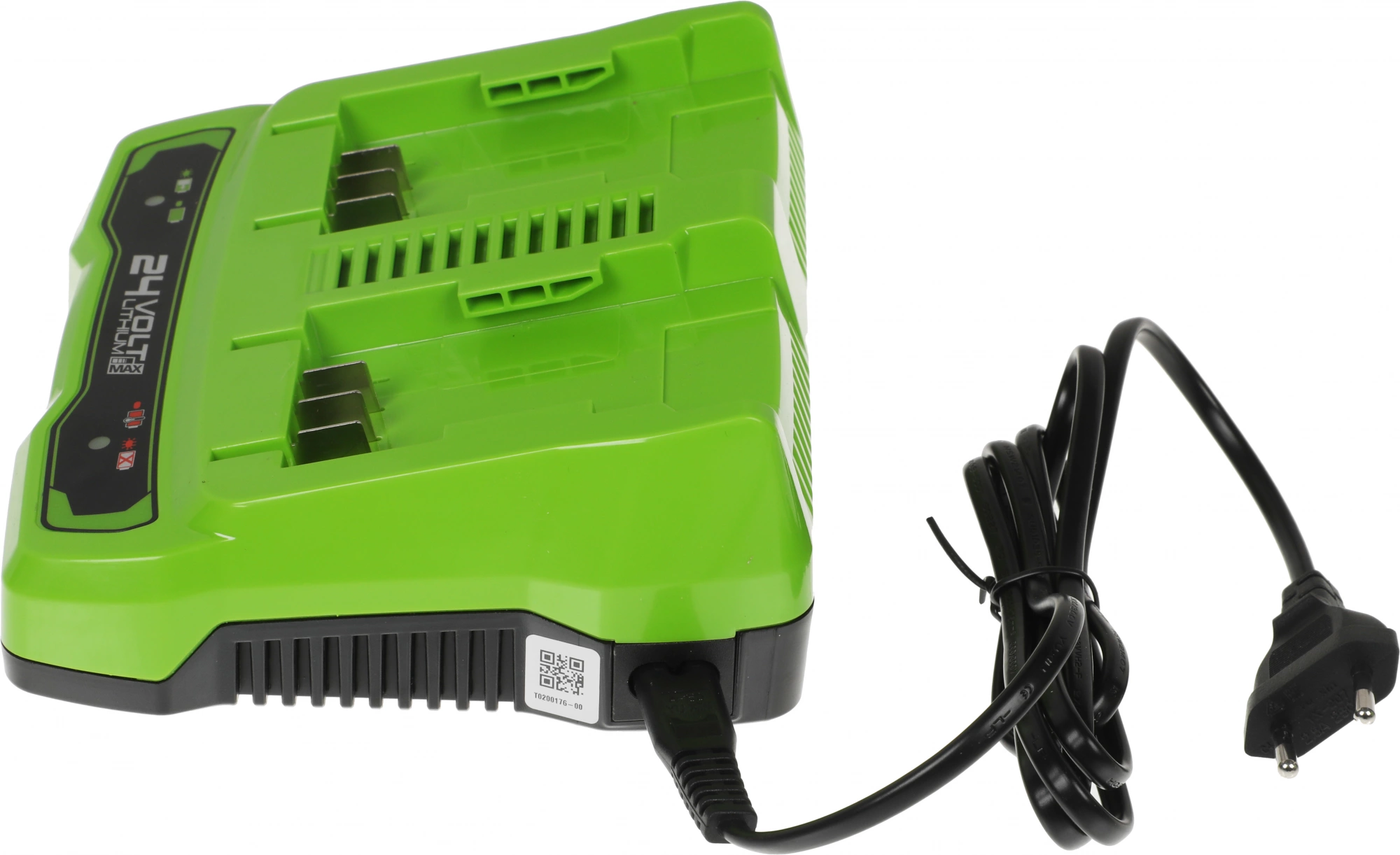 Зарядное устройство на 2 слота Greenworks G24X2UC2 24V 2931907 — применяется для синхронной/параллельной зарядки двух аккумуляторов напряжением 24 вольт и емкостью 2А/ч и 4 А/ч. В плату зарядки встроен чип защиты от перезарядки и при достижении уровня заряда 100% устройство отключается.
