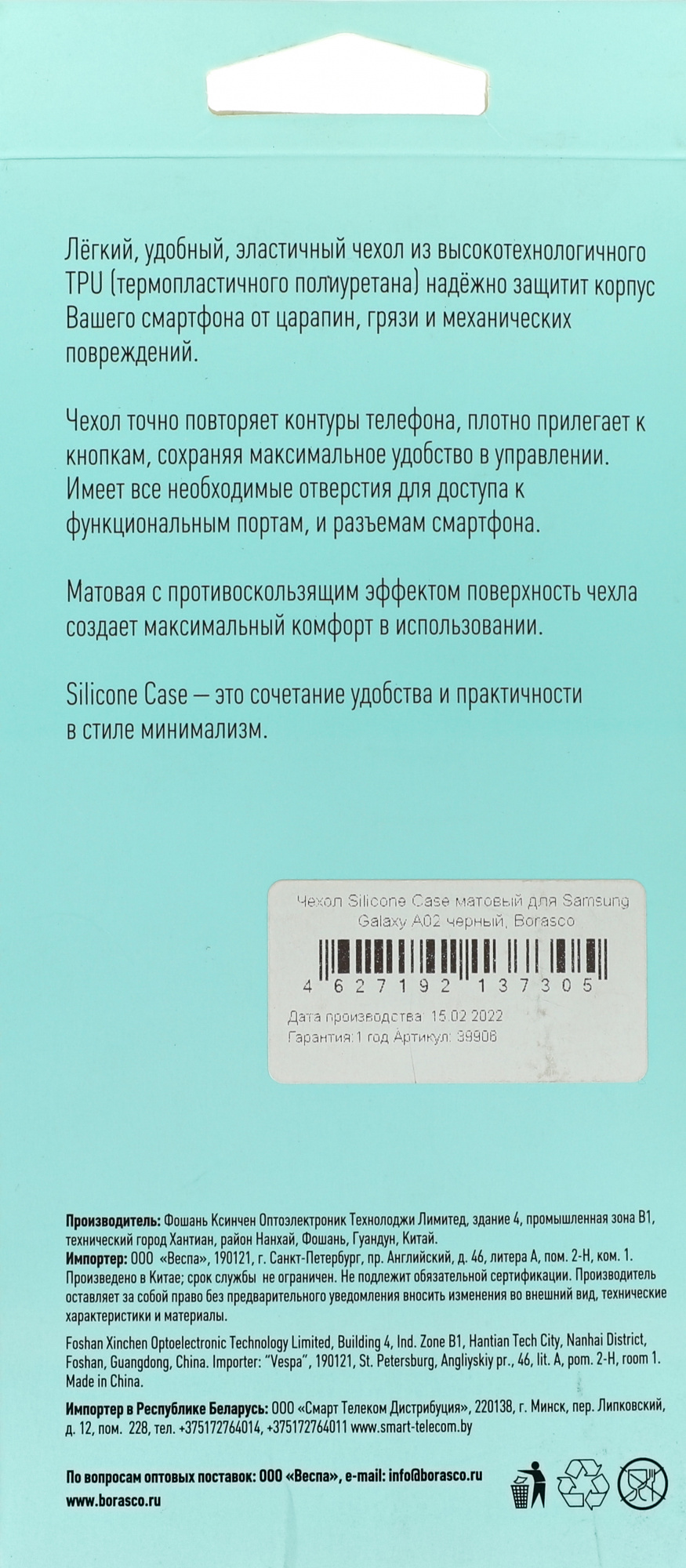 Силиконовый чехол BoraSco специально разработан для смартфонов Samsung Galaxy A02. Благодаря толщине материала не более 0,8мм чехол минимально увеличивает размеры смартфона, при этом защищает заднюю панель от царапин, грязи и пыли, а матовая поверхность предотвращает выскальзывание из рук.