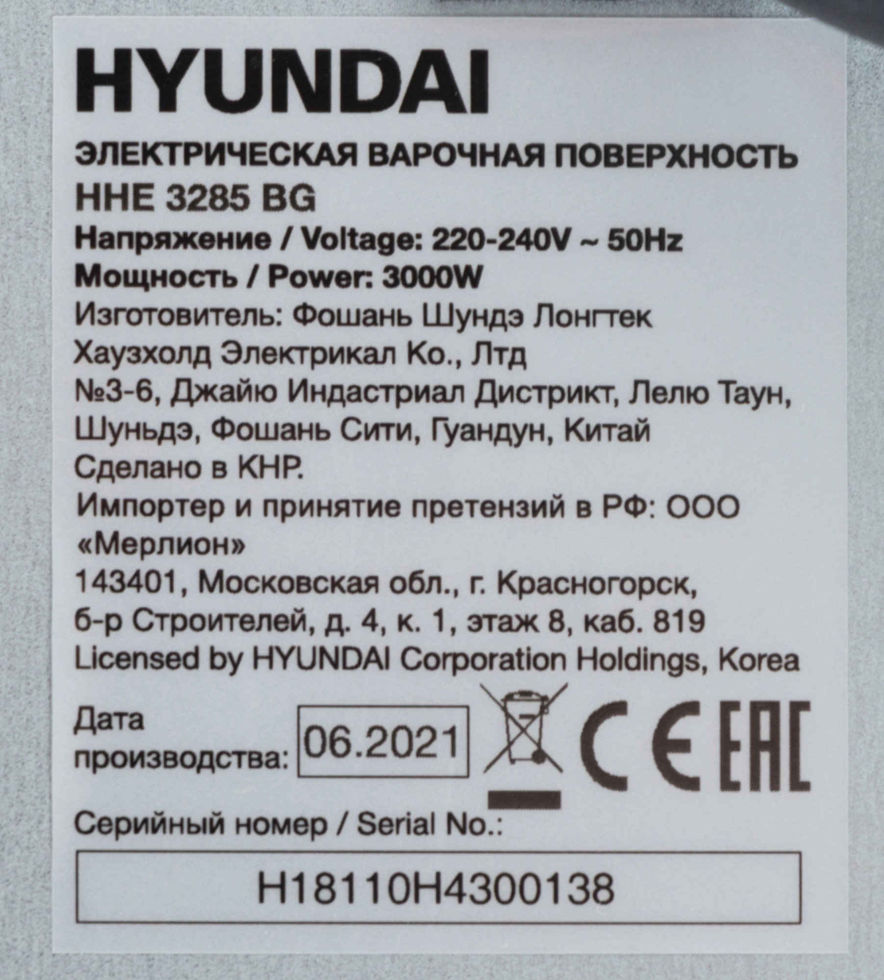 Варочная поверхность Hyundai HHE 3285 BG черный