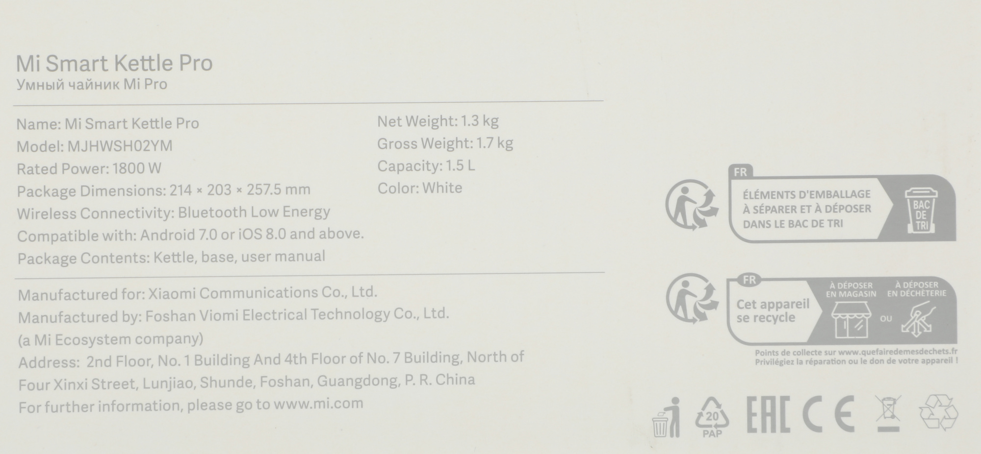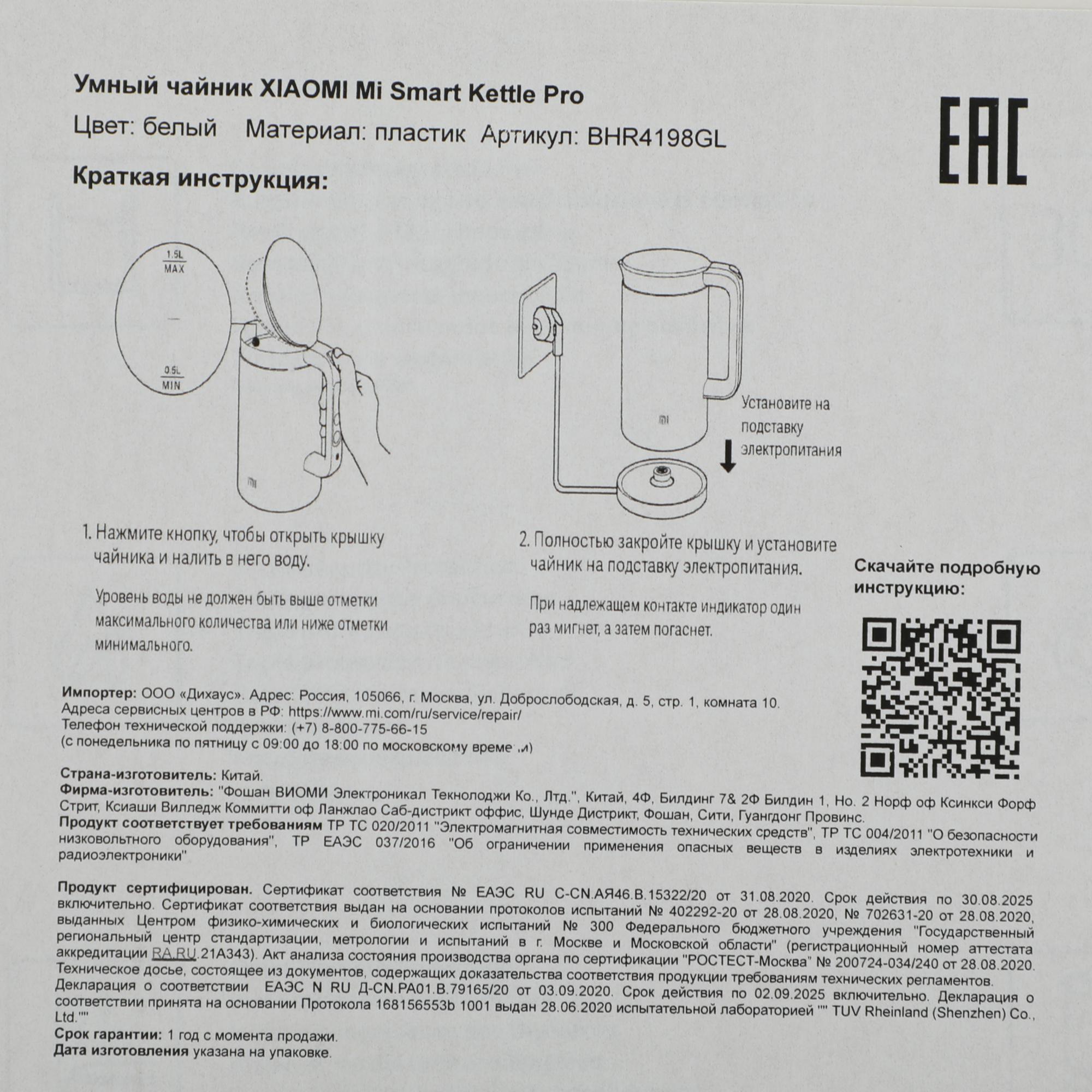 Чайник электрический Xiaomi Mi Smart Kettle Pro 1.5л. 1800Вт белый корпус: металл/пластик (BHR4198GL)